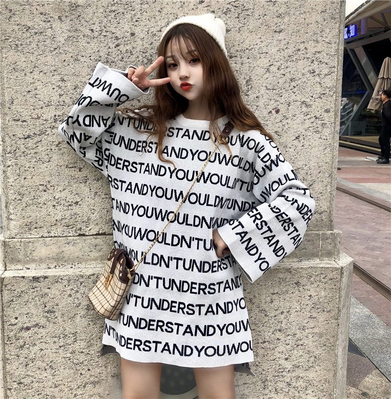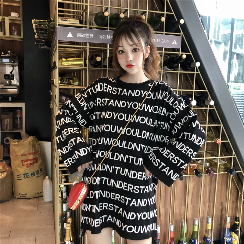 秋季女裝韓版中長款原宿風字母針織衫慵懶風寬松網紅套頭毛衣外套