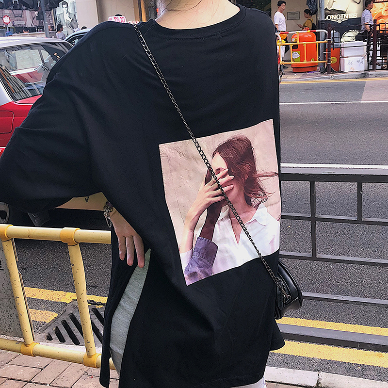 / 套裝女早秋新款女裝韓版中長款開叉印花短袖T恤+高腰條紋打底褲潮