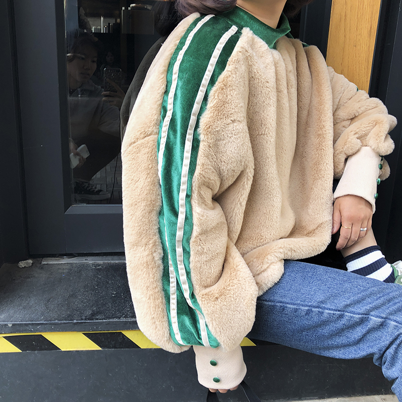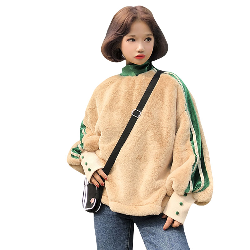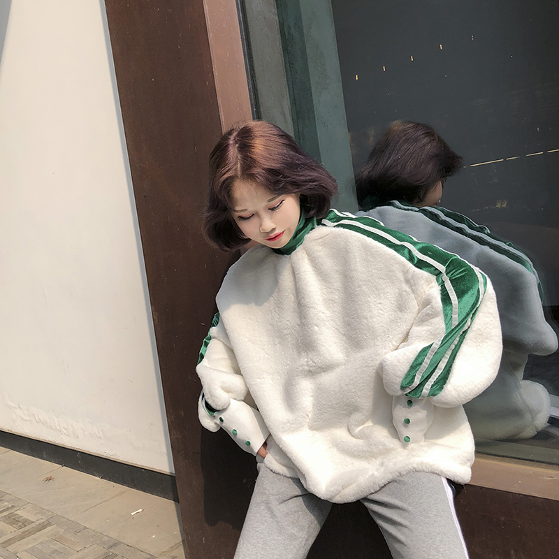 / 秋冬韓版寬松柔軟毛毛拼接絨條紋加厚保暖套頭超火衛衣上衣外套女