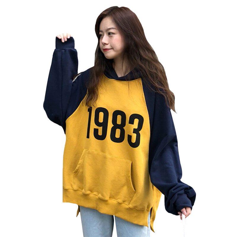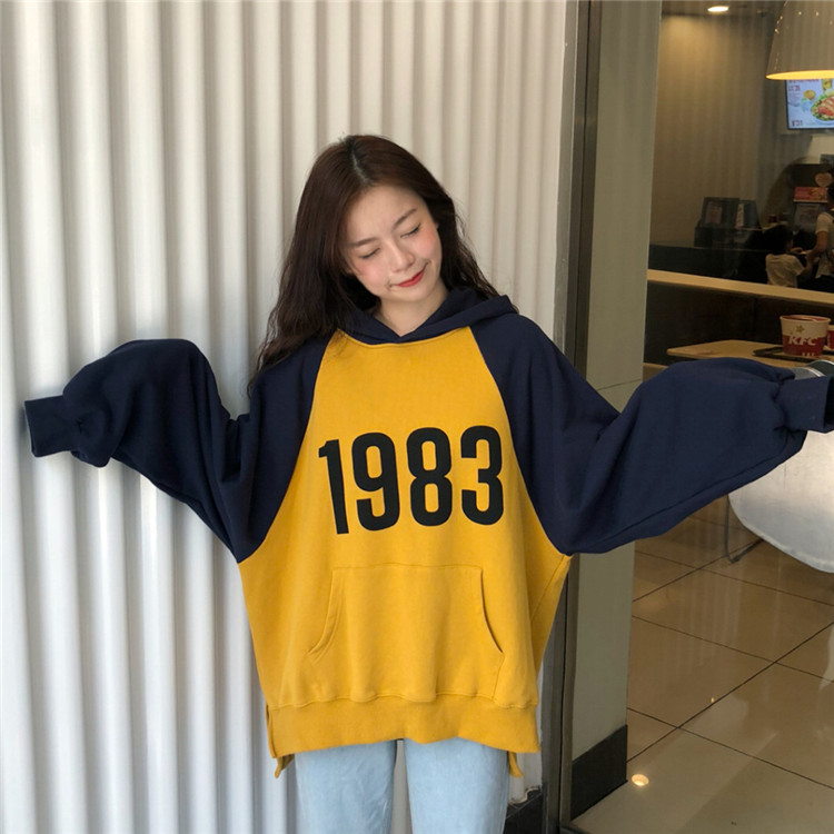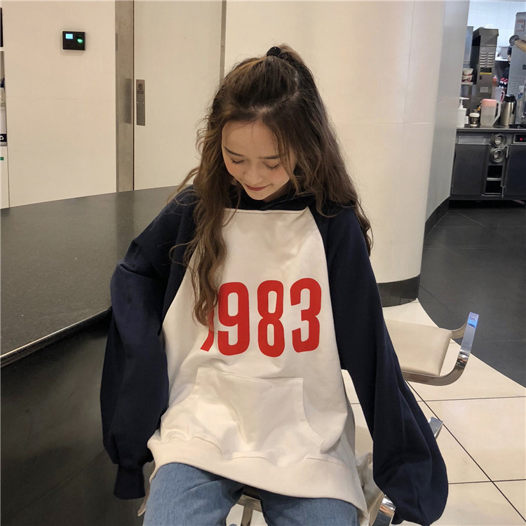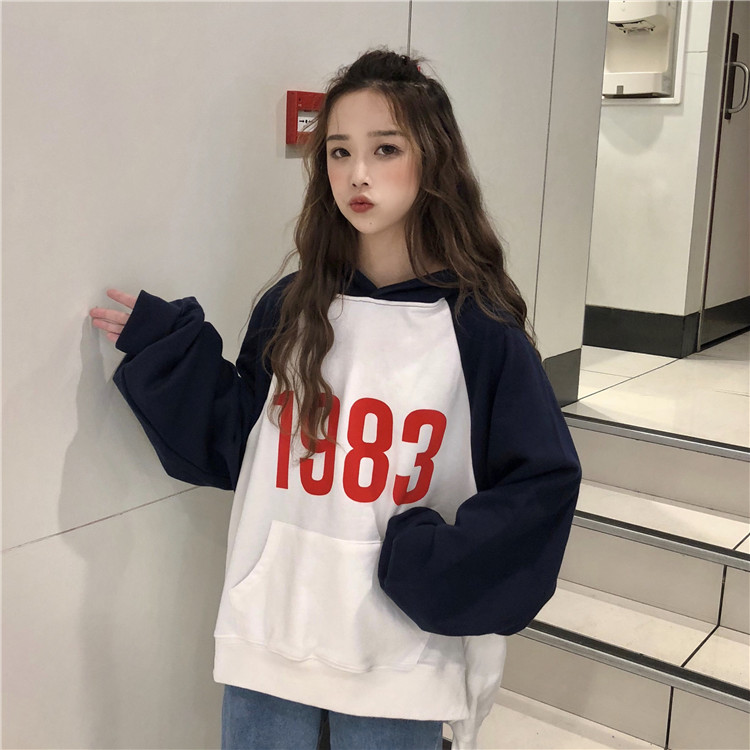 / 秋季女裝韓版學院風數字寬松撞色插肩袖連帽套頭衛衣長袖上衣外套