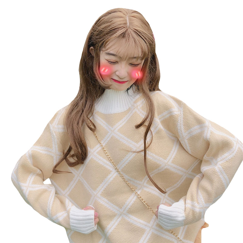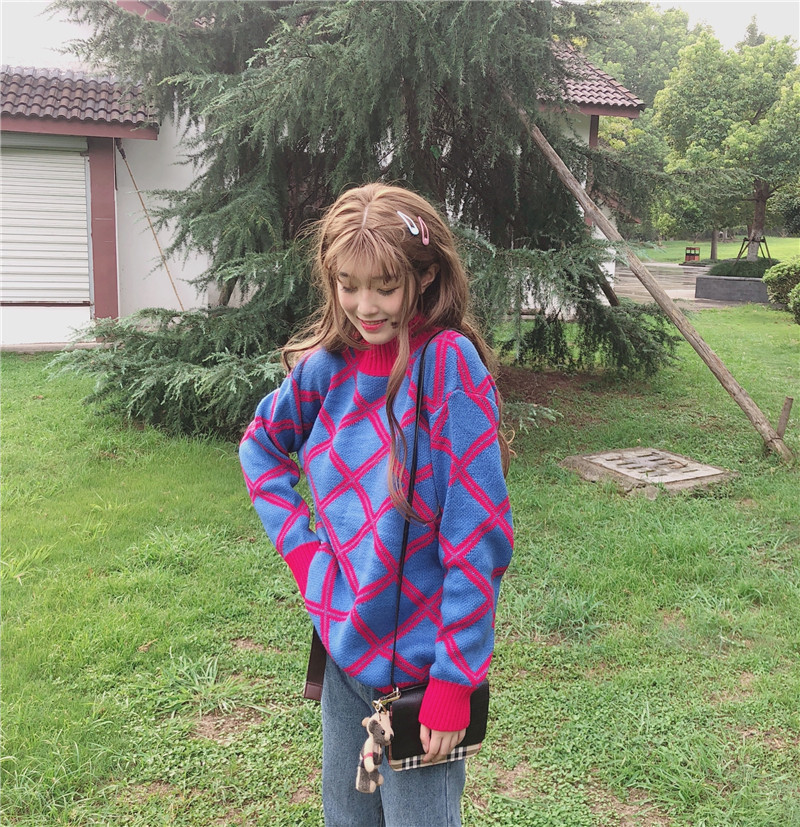 / 秋裝女裝韓版學院風BF風寬松高領菱格網紅套頭針織衫毛衣上衣外套