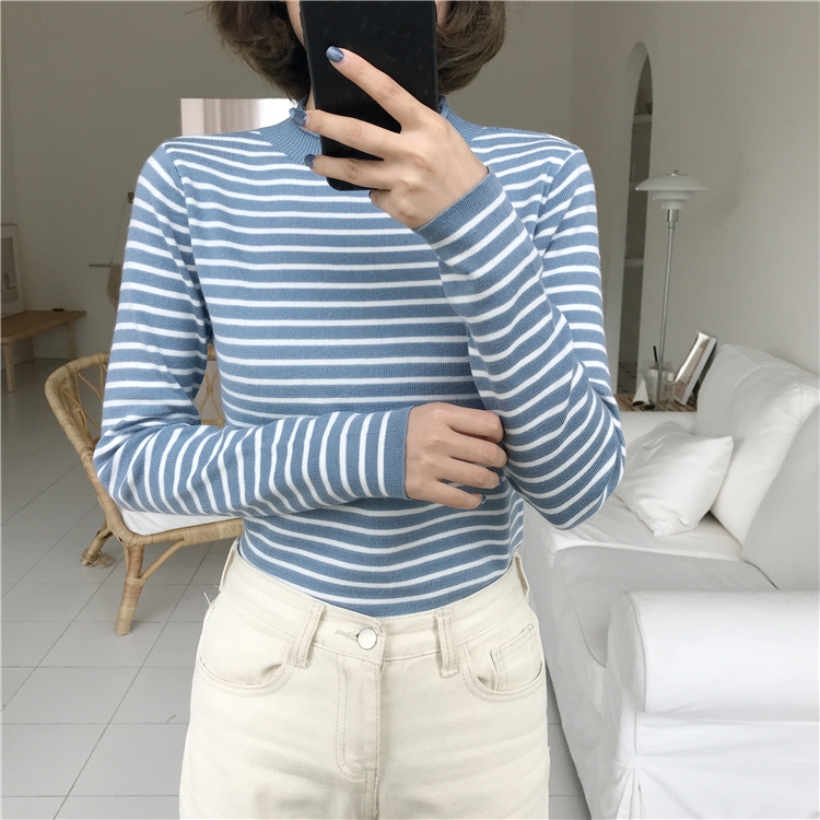 秋冬韓版學院風條紋修身顯瘦網紅套頭長袖針織衫打底衫毛衣上衣女