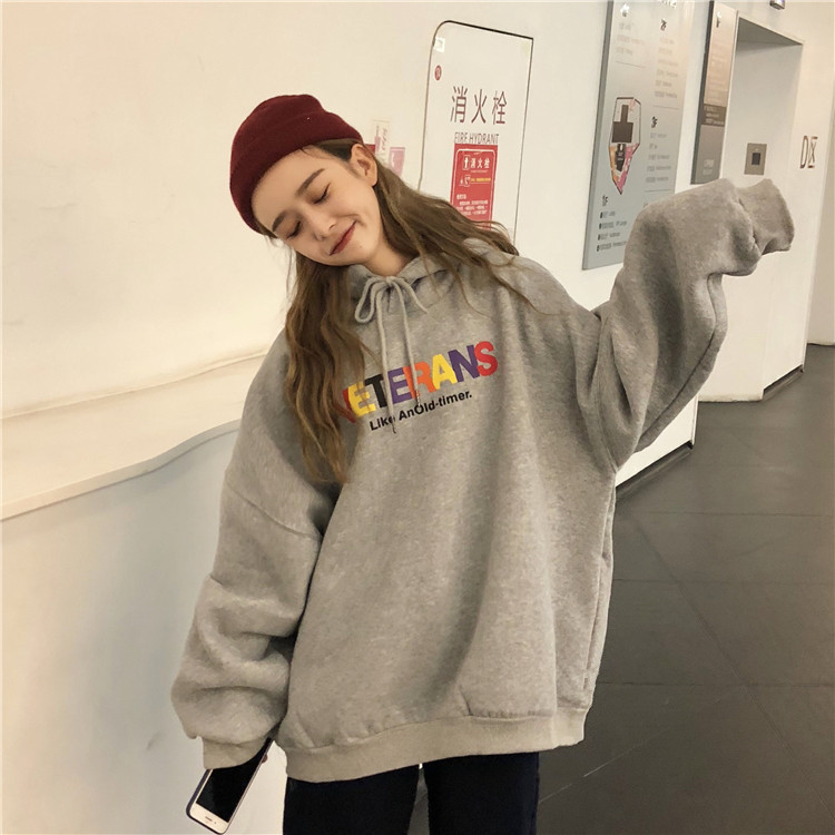 / 秋冬女裝韓版中長款原宿風彩色字母寬松加絨加厚連帽衛衣上衣外套