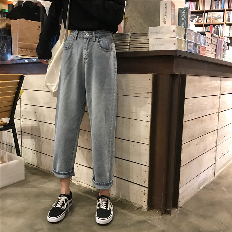 / 秋季韓版水洗做舊淺色牛仔褲寬松高腰顯瘦直筒褲闊腿褲長褲學生女