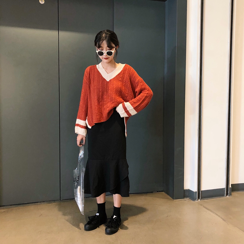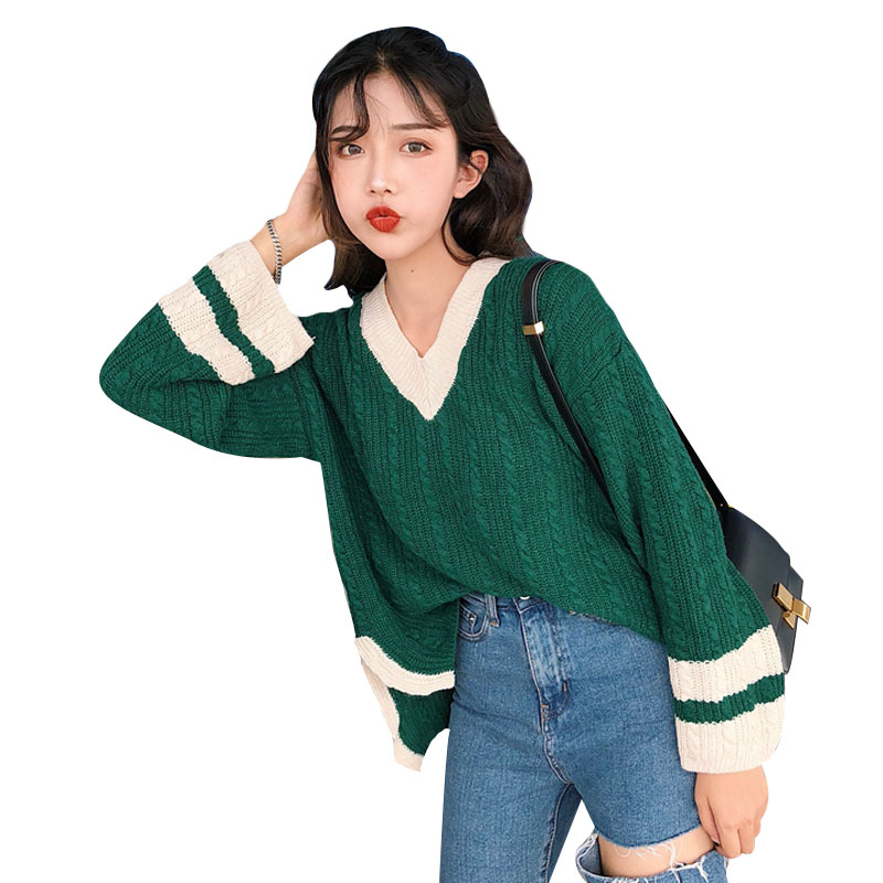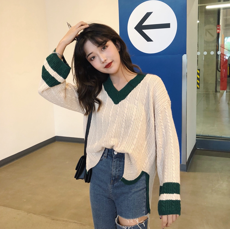 / 秋冬女裝韓版寬松V領拼色慵懶風毛衣學生套頭長袖針織衫上衣外套