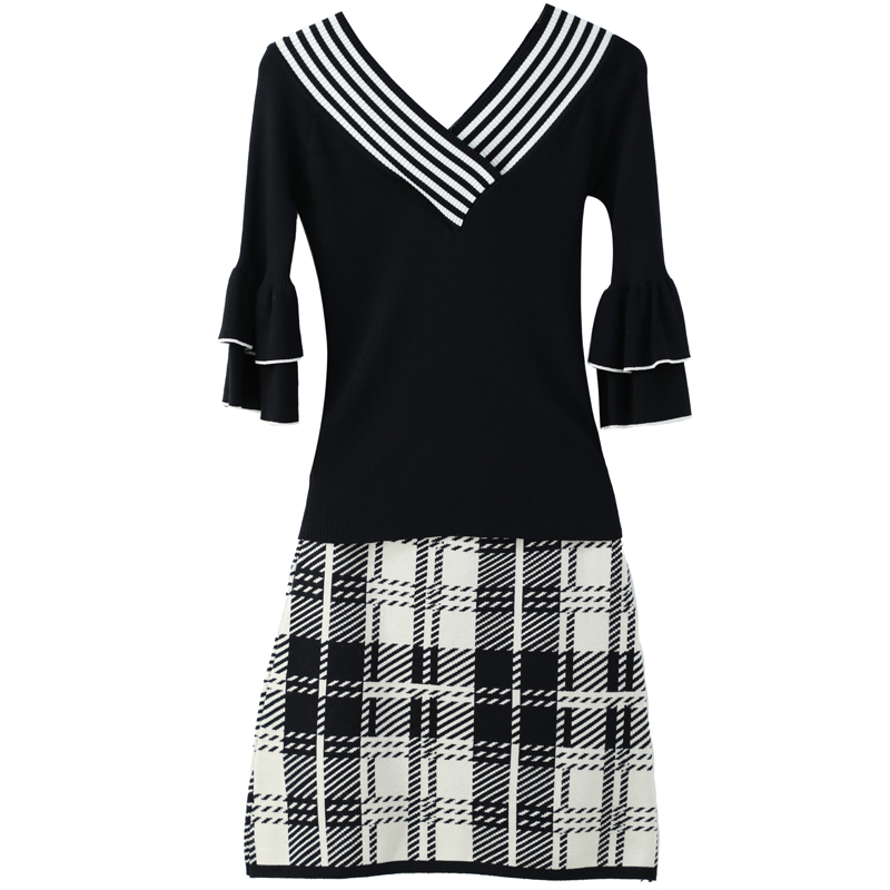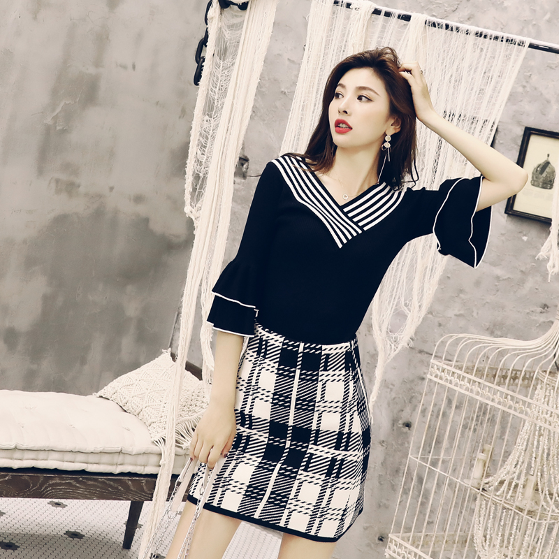 / 歐洲站秋季新款女裝針織衫上衣休閑毛衣短款格子半身裙洋氣套裝潮