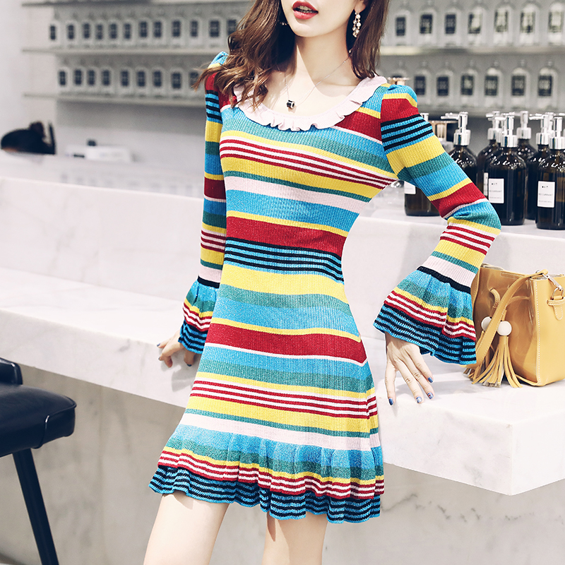 / 2018秋新款修身圓領長袖撞色條紋針織連衣裙修身a字裙子潮