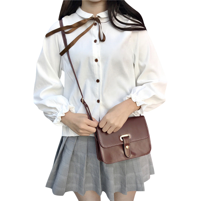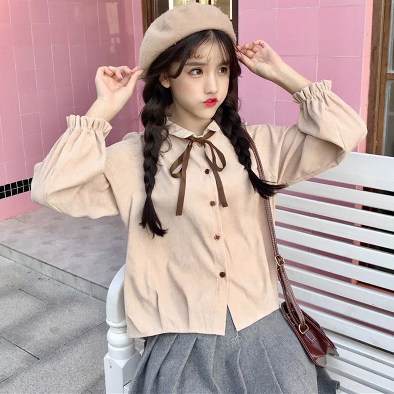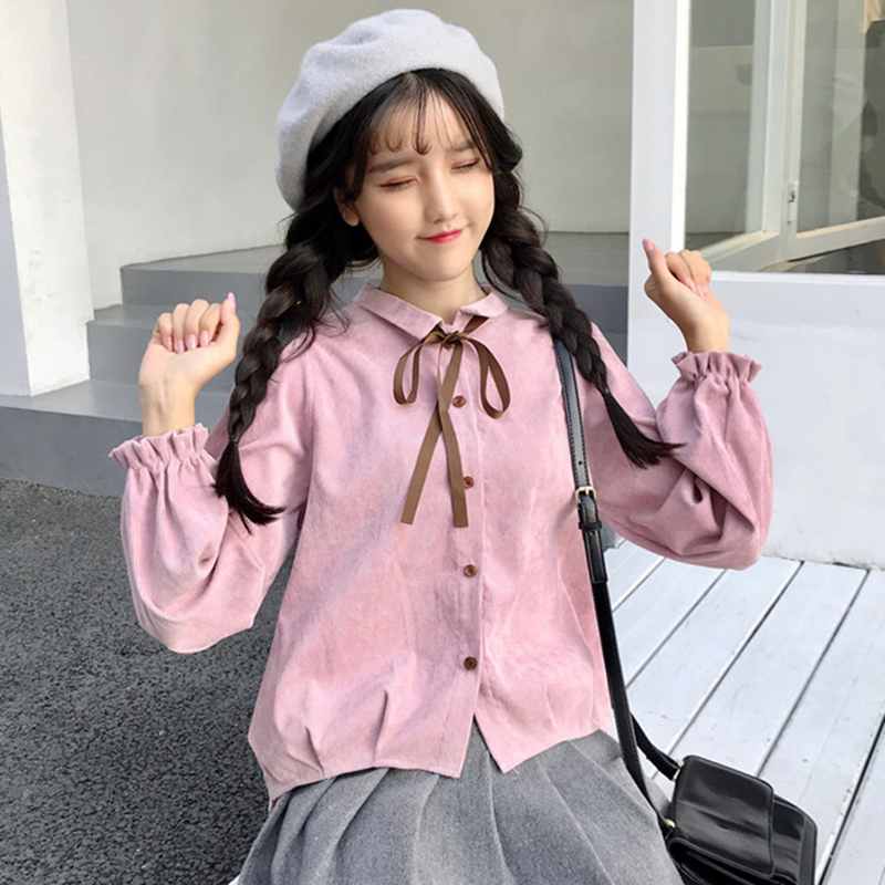 / 秋冬新款女裝清新燈芯絨蝴蝶結系帶寬松顯瘦學生長袖休閑襯衫上衣