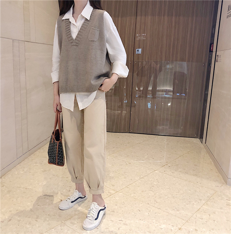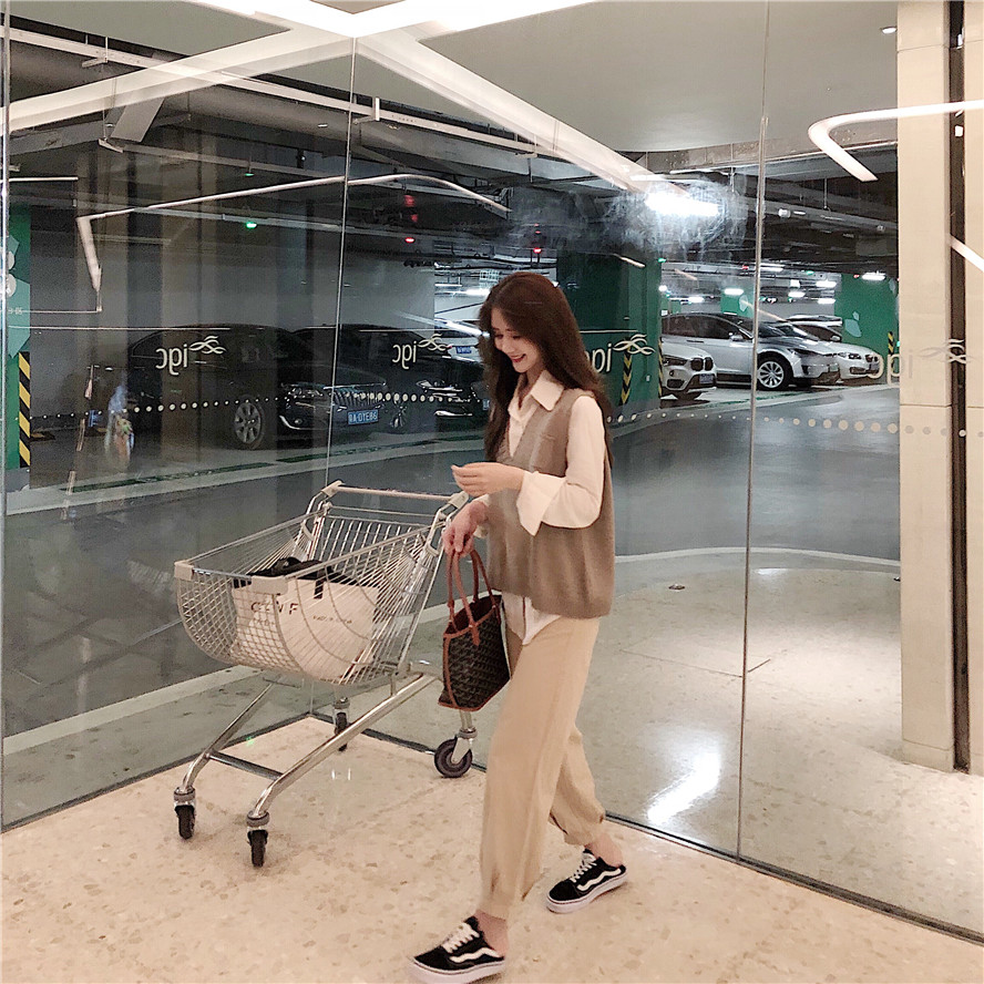 / 韓版時尚休閑套裝秋季女裝束腳燈籠褲+針織馬甲+打底衫襯衣三件套
