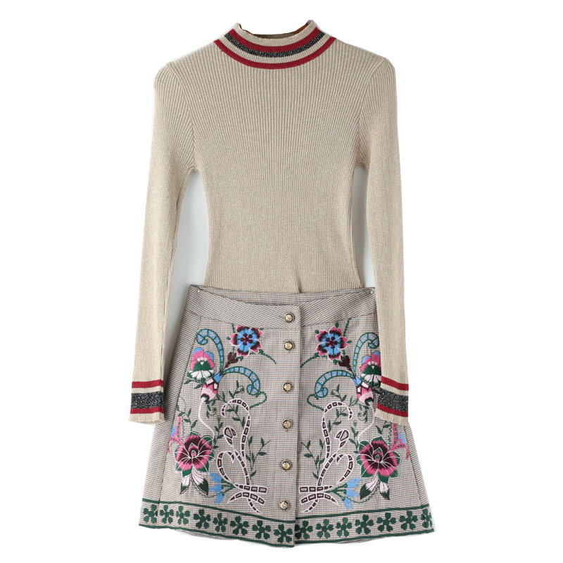 / 2018秋裝新款薄款上袖針織衫上衣繡花高腰復古A字半裙套裝兩件套