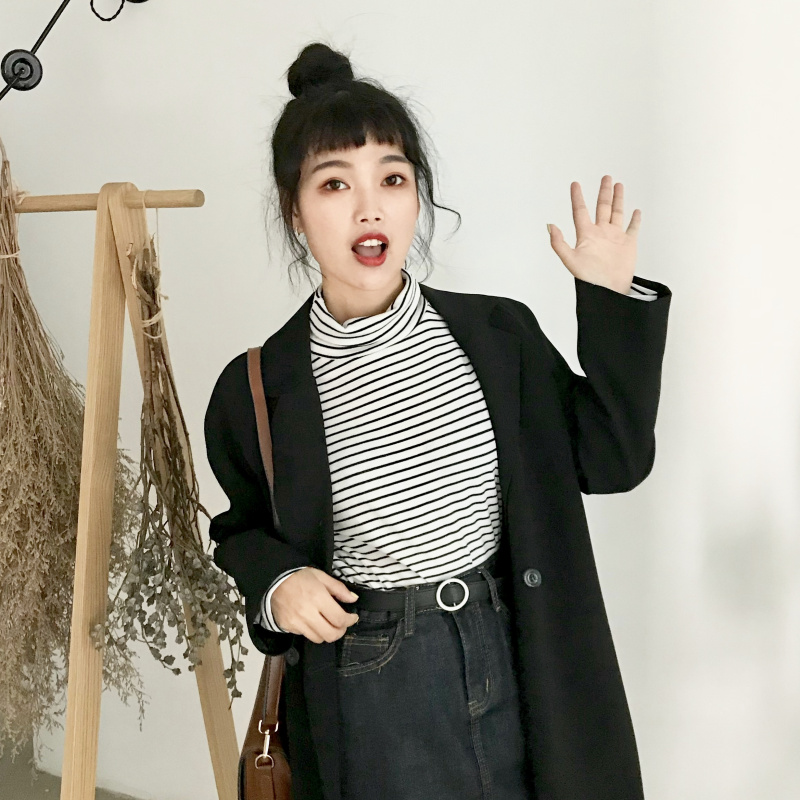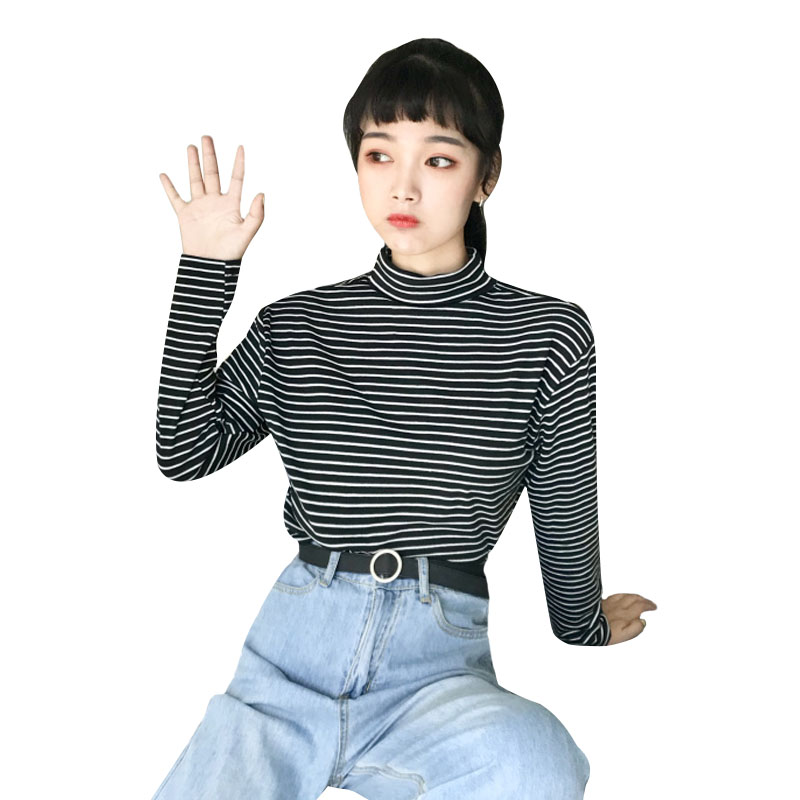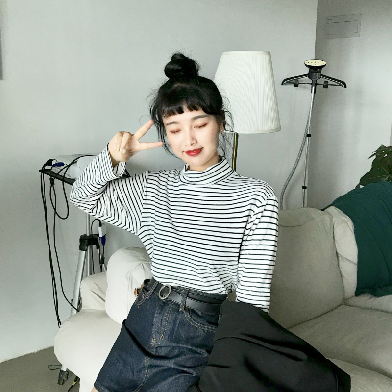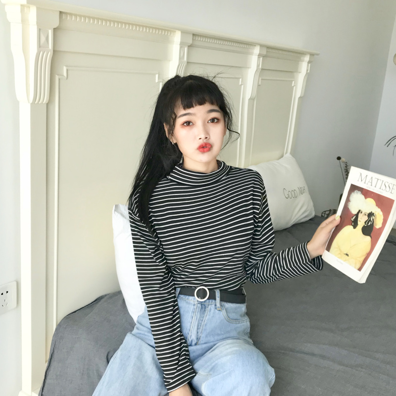 秋季女裝2018新款韓版修身顯瘦條紋高領學生長袖打底衫T恤上衣潮