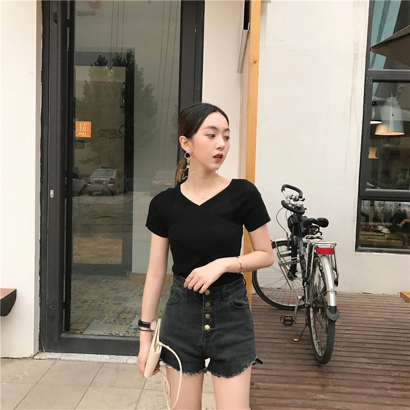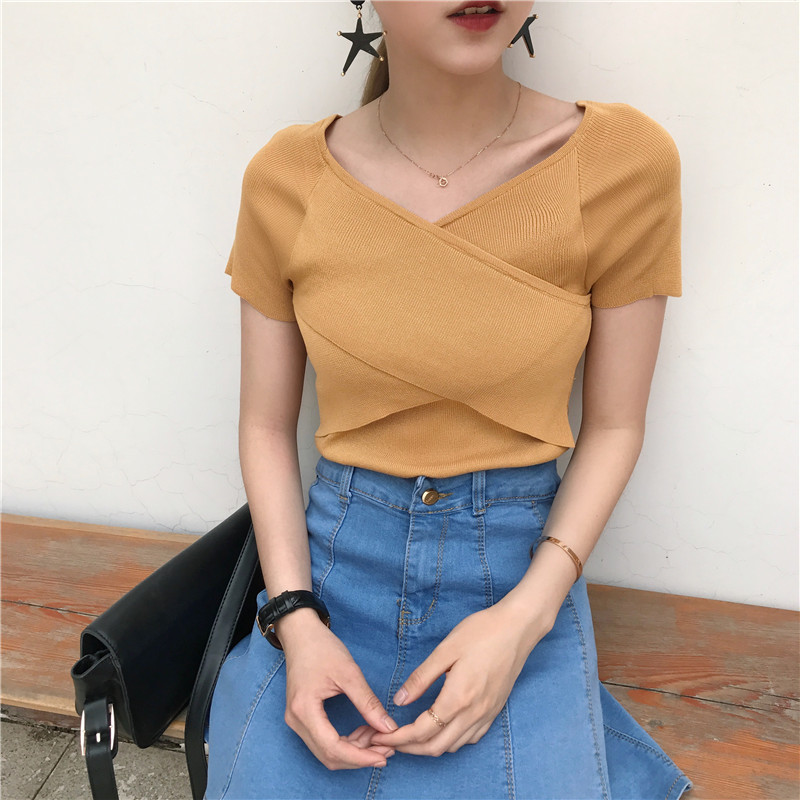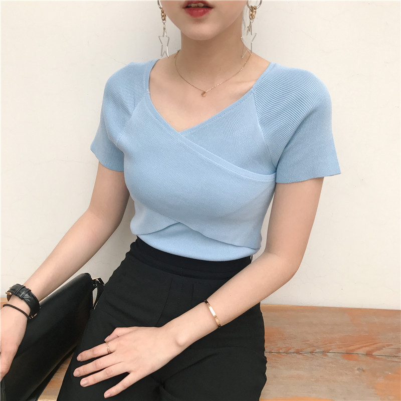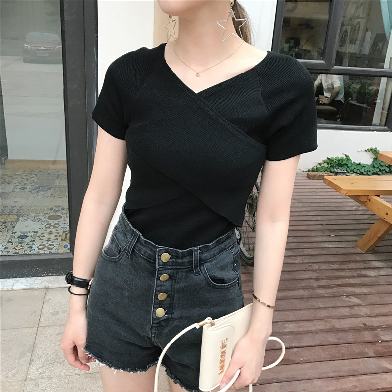 / 春夏新款女裝氣質交叉V領修身顯瘦短款學生百搭針織短袖T恤上衣女