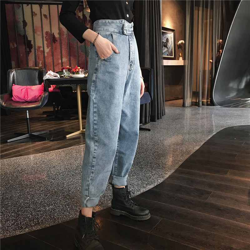 秋季韓版高腰兩粒扣牛仔褲復古水洗做舊寬松闊腿褲直筒褲九分褲女