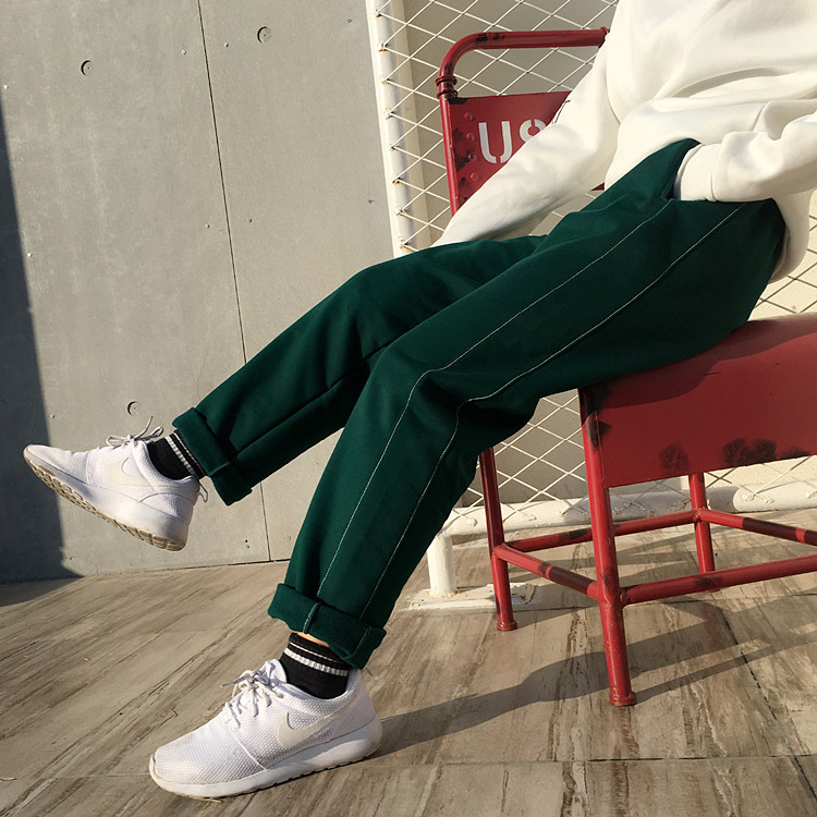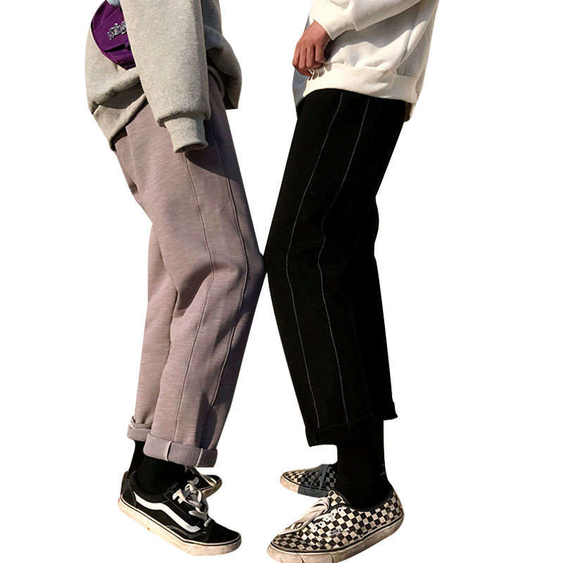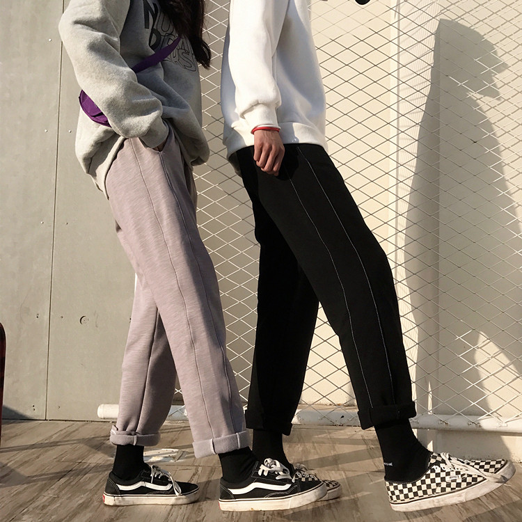 / 秋冬韓版原宿風線條休閑褲運動褲寬松加絨加厚闊腿褲直筒褲長褲女