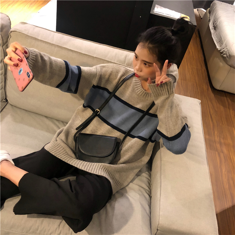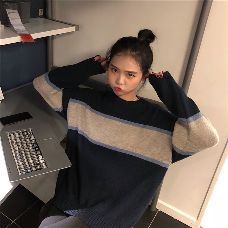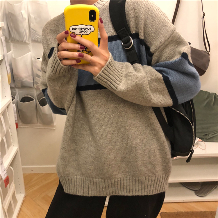 秋冬女裝韓版chic慵懶風撞色寬松網紅套頭超火針織衫毛衣上衣外套