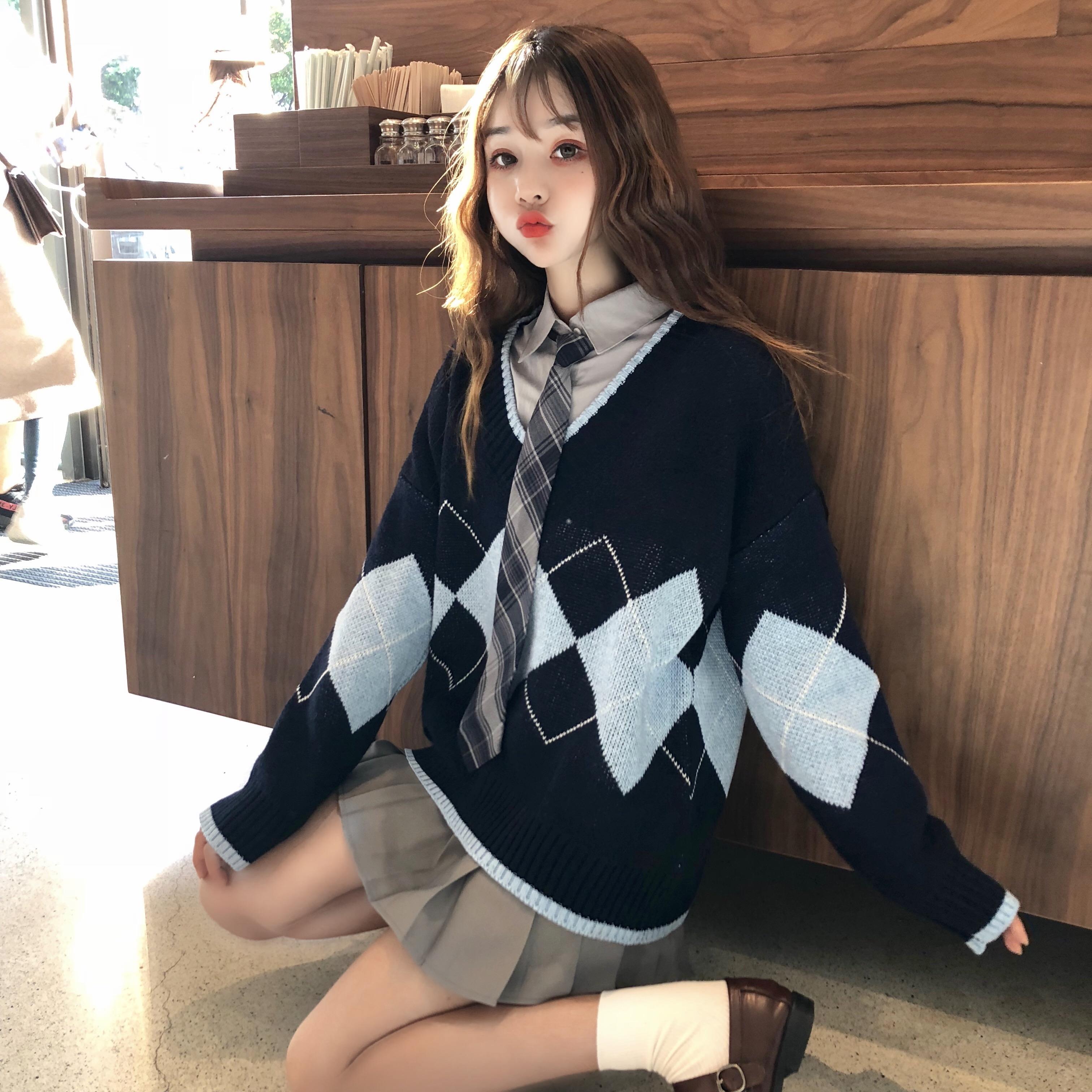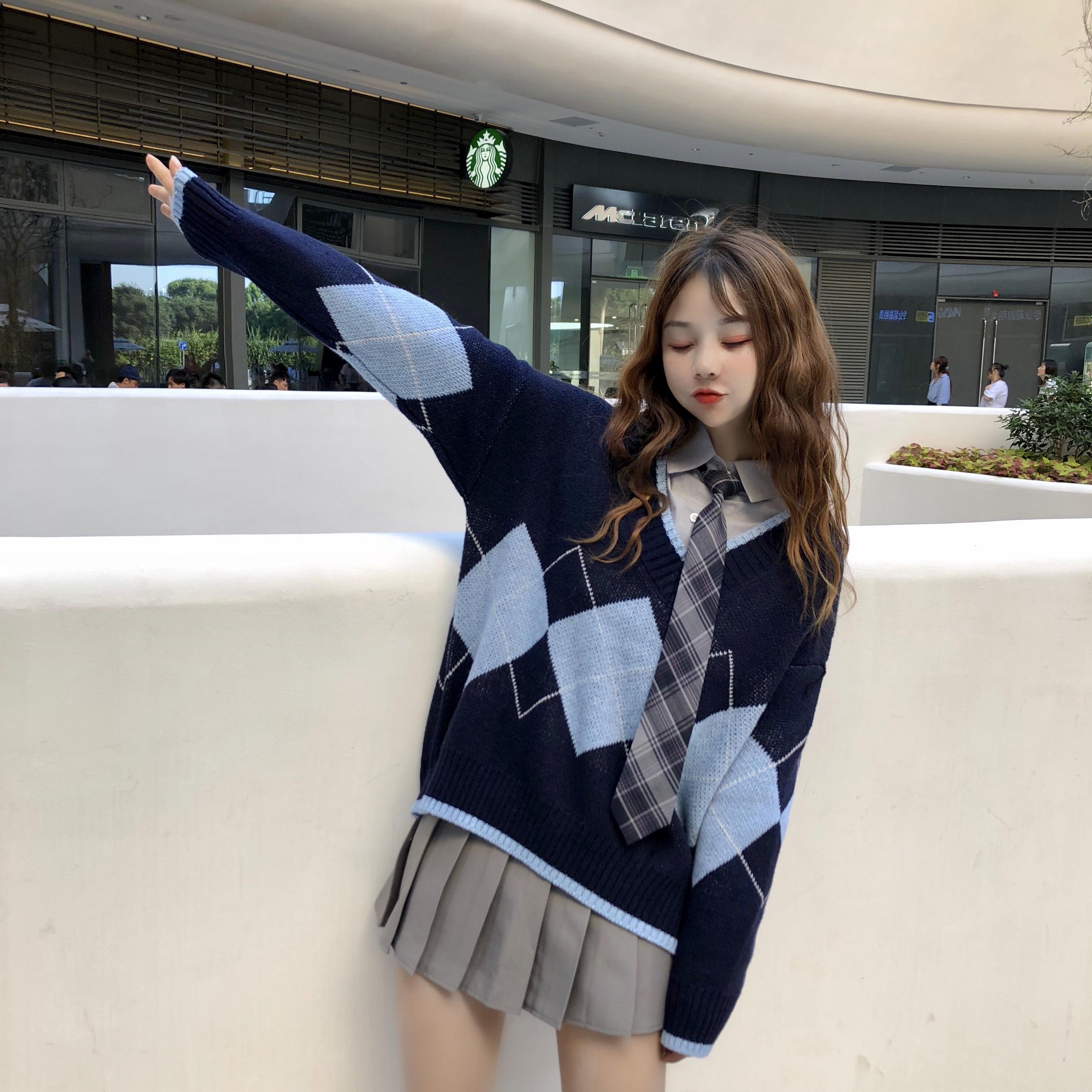 / 韓版時尚休閑套裝秋季女裝菱格毛衣外套+襯衣+百褶裙半身裙三件套