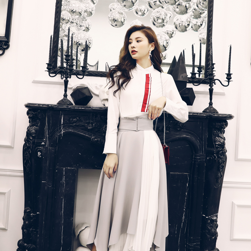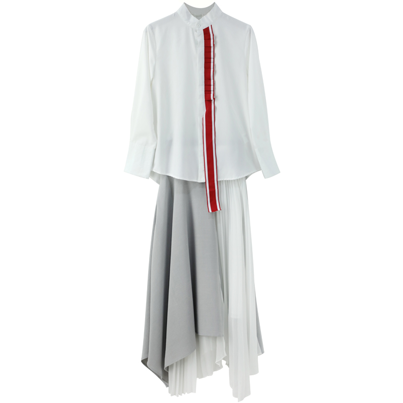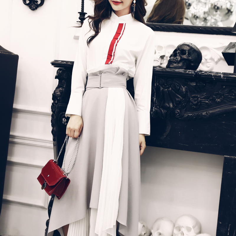 / 秋季女套裝2018新款氣質時髦長袖襯衫高腰不規則拼接半身裙兩件套