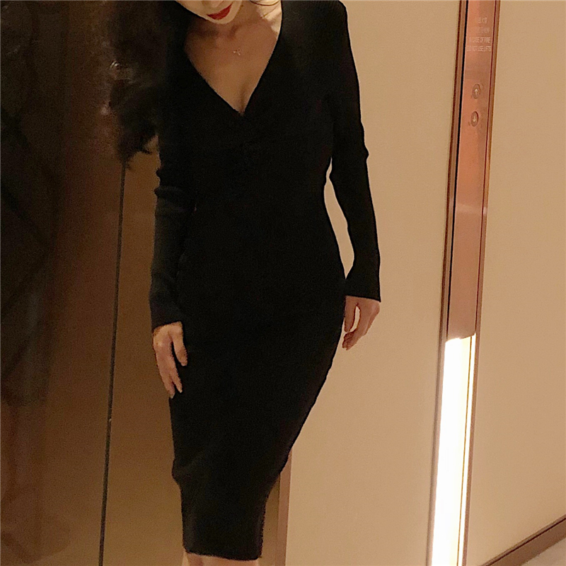 / 裙子秋女2018新款溫柔風復古港味修身性感氣質長裙長袖針織連衣裙