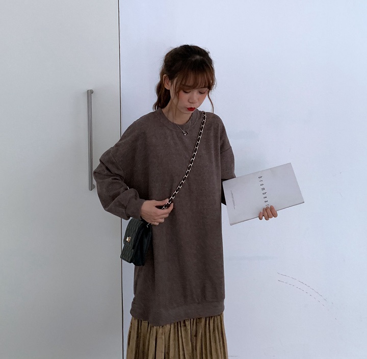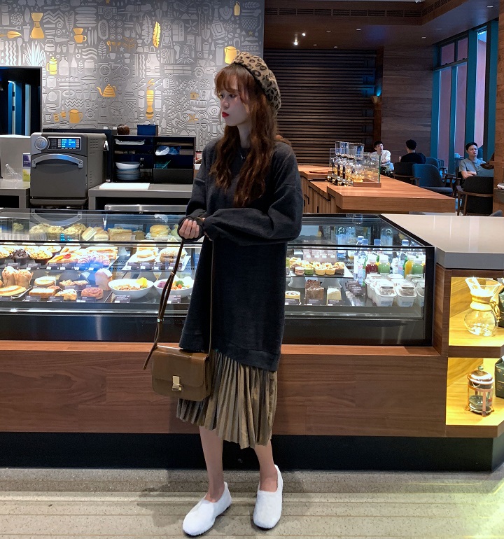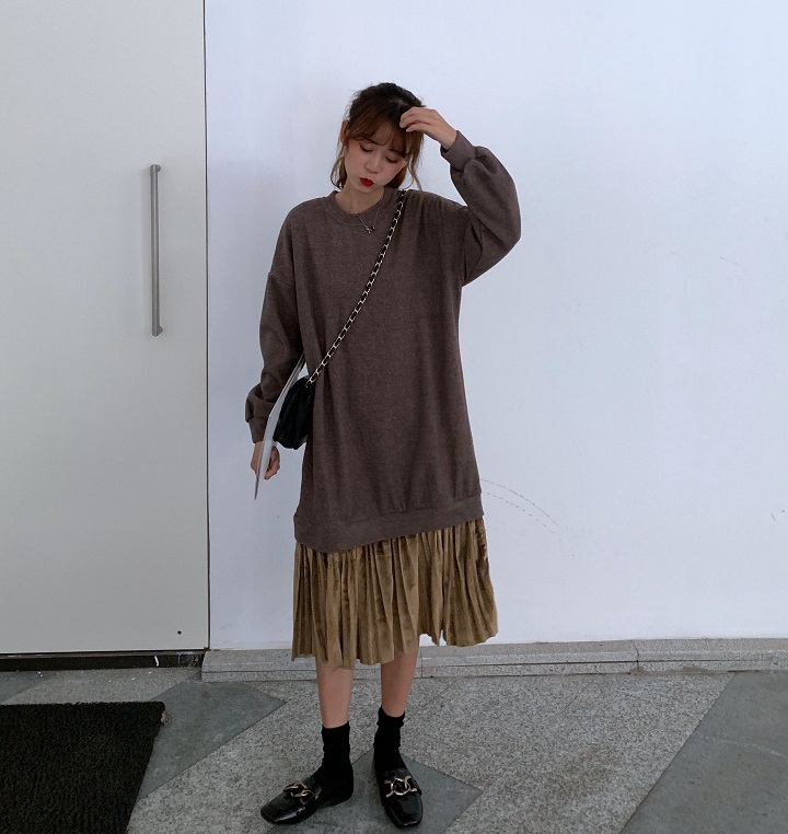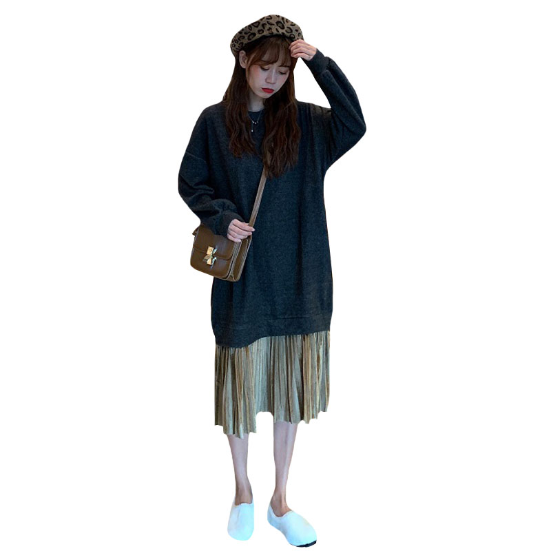 / 秋冬韓版氣質中長款拼接百褶裙寬松長袖套頭加厚打底連衣裙長裙女