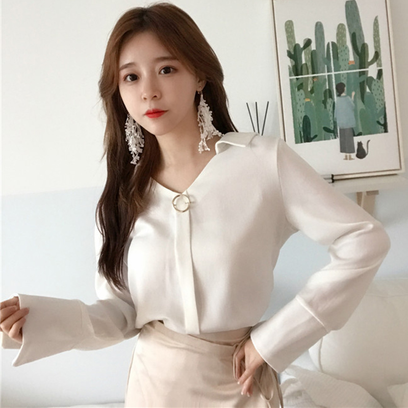 / 初秋新款韓版女裝港味復古氣質V領長袖雪紡襯衫少女純色百搭上衣