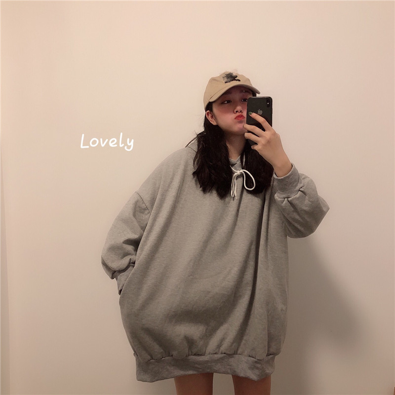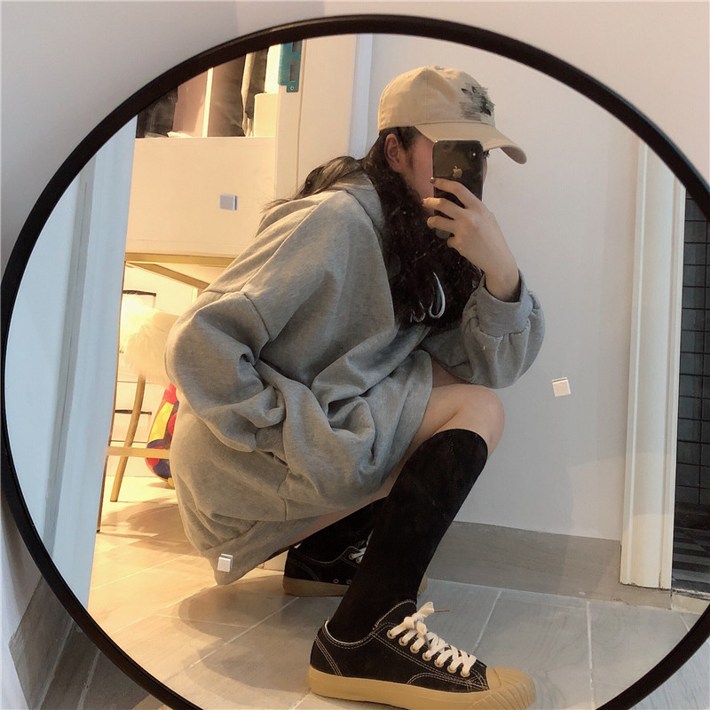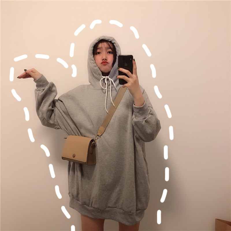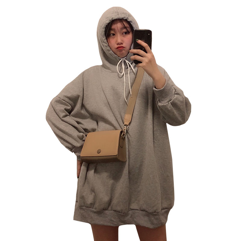 / 秋冬女裝韓版寬松中長款純色連帽加絨加厚套頭超火衛衣裙上衣外套