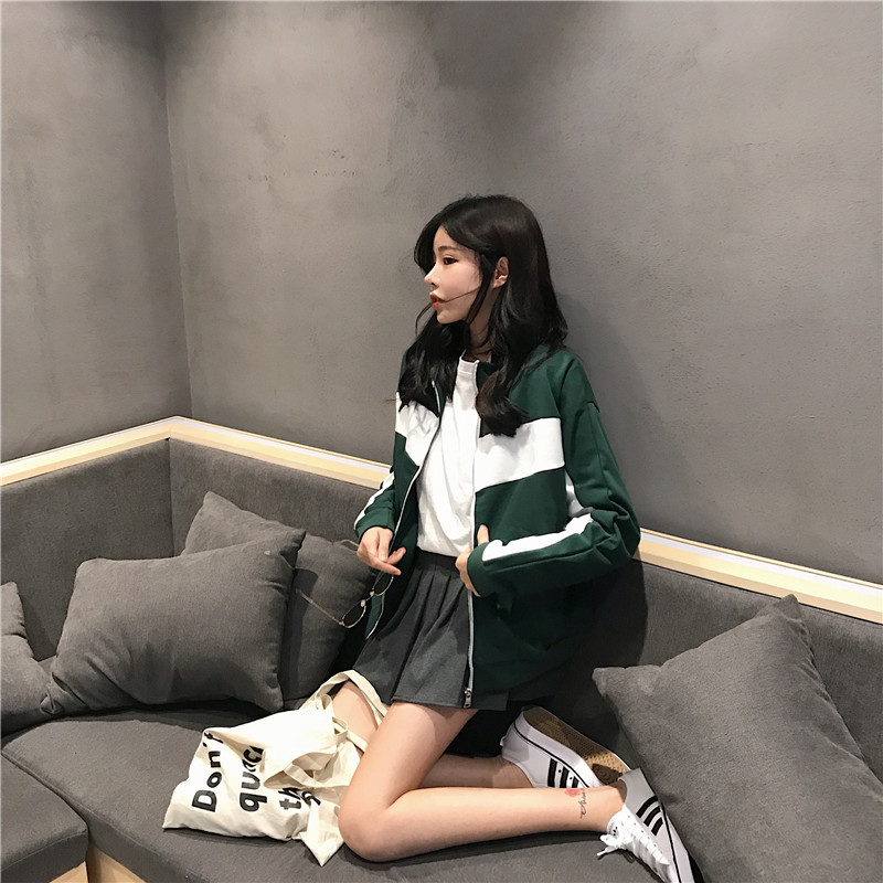 秋裝2018新款韓版復古運動風拼色學生寬松休閑長袖開衫上衣外套女