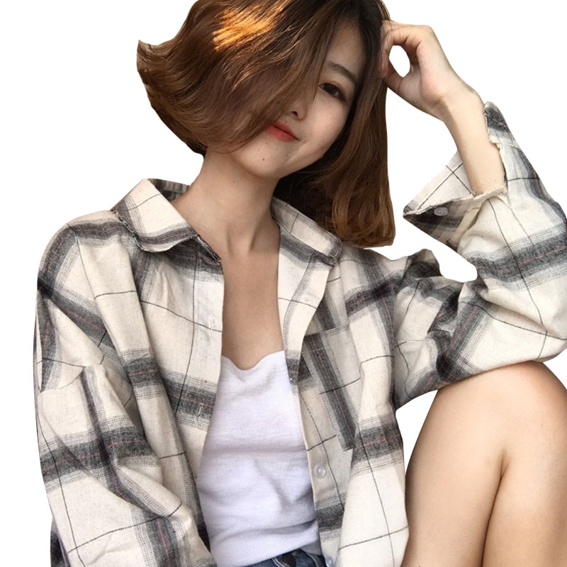 / 秋季女裝韓版寬松百搭顯瘦大格子長袖襯衫中長款休閑襯衣上衣外套