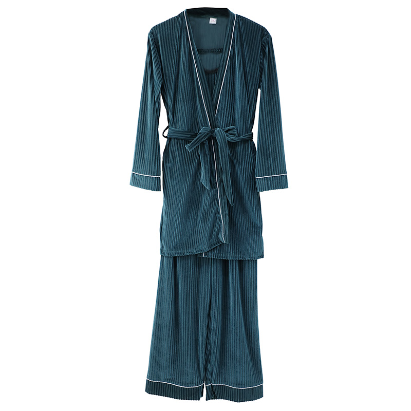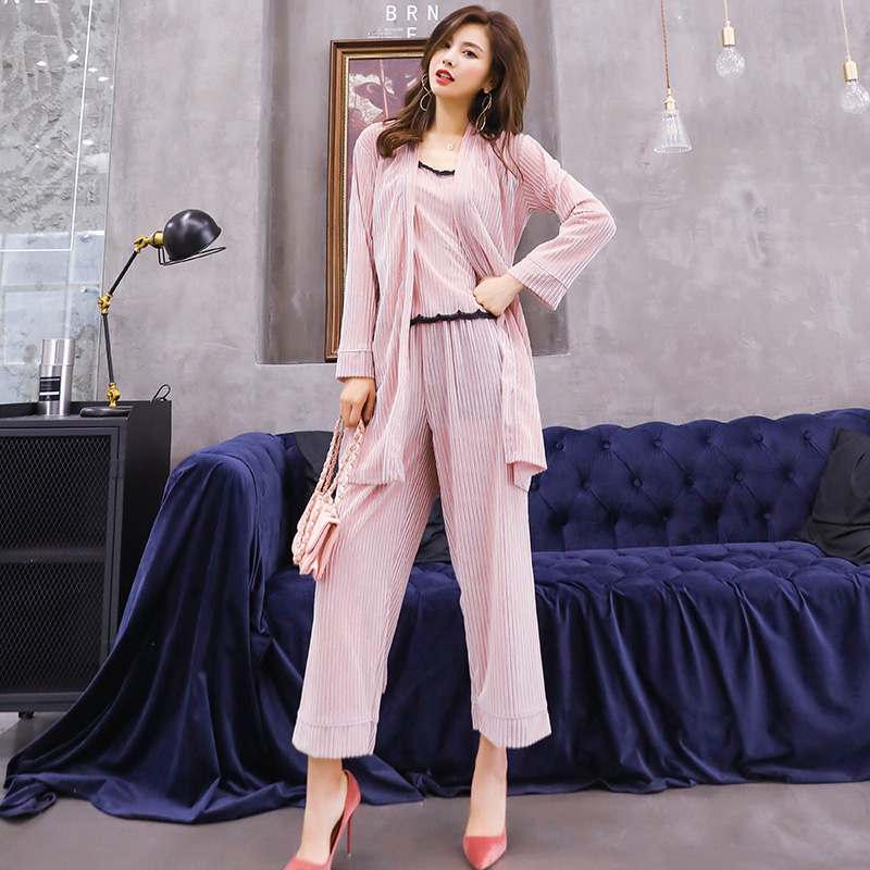 / 睡衣女秋冬絲絨三件套吊帶新款韓國寬松長袖睡袍可外穿家居服套裝