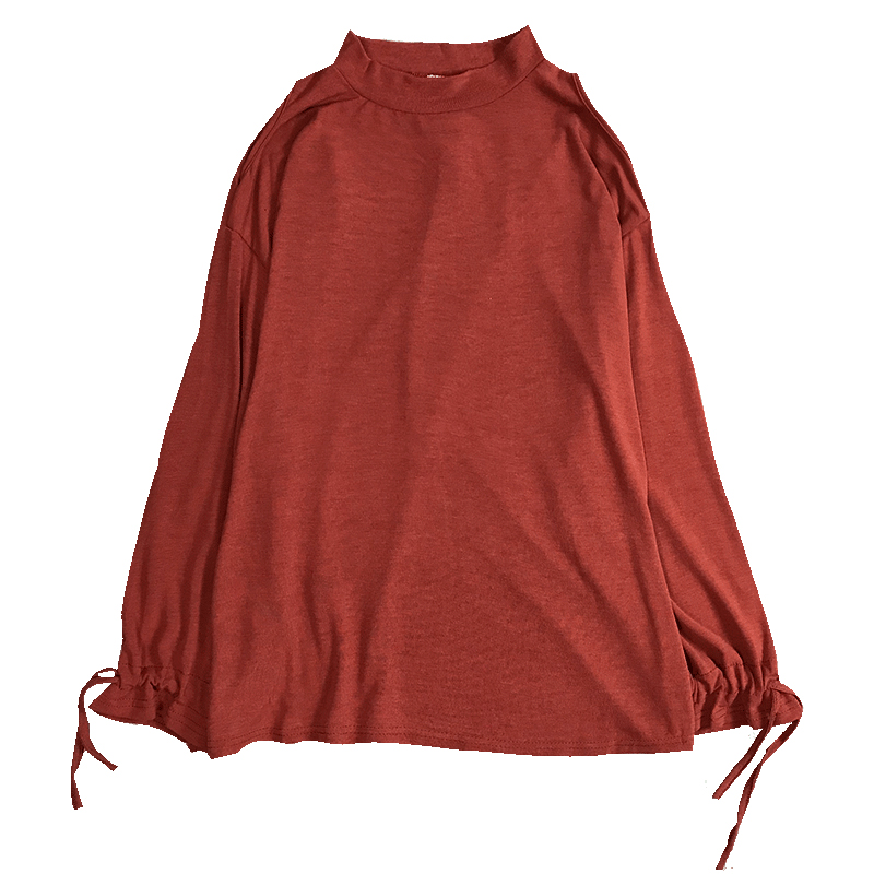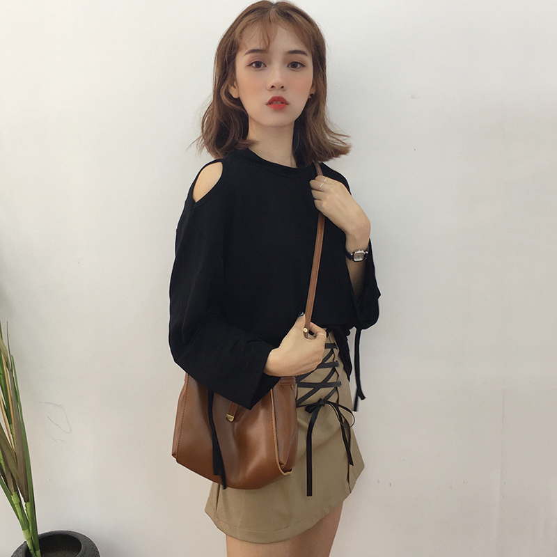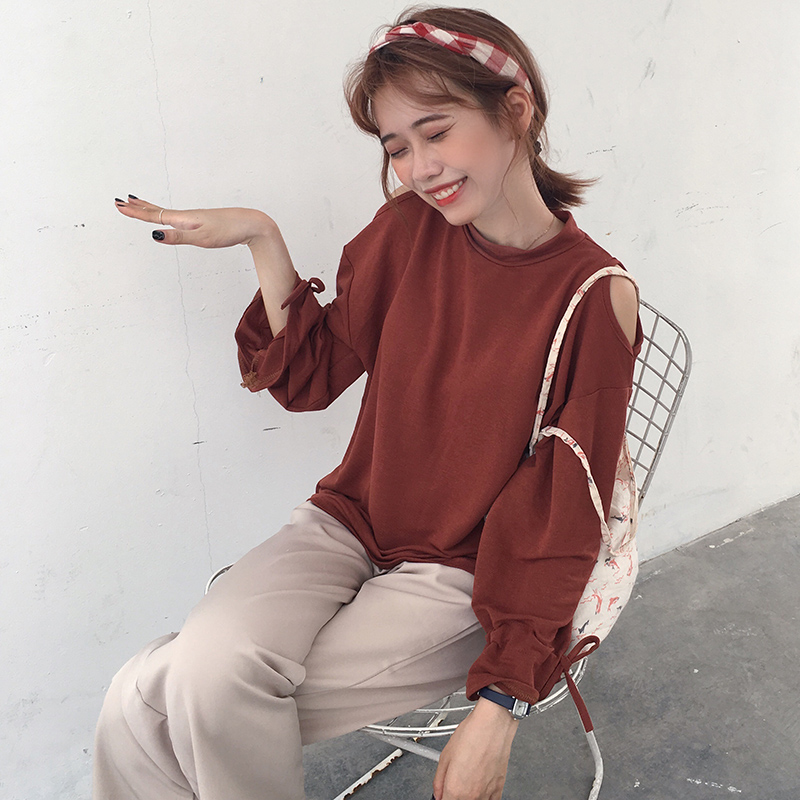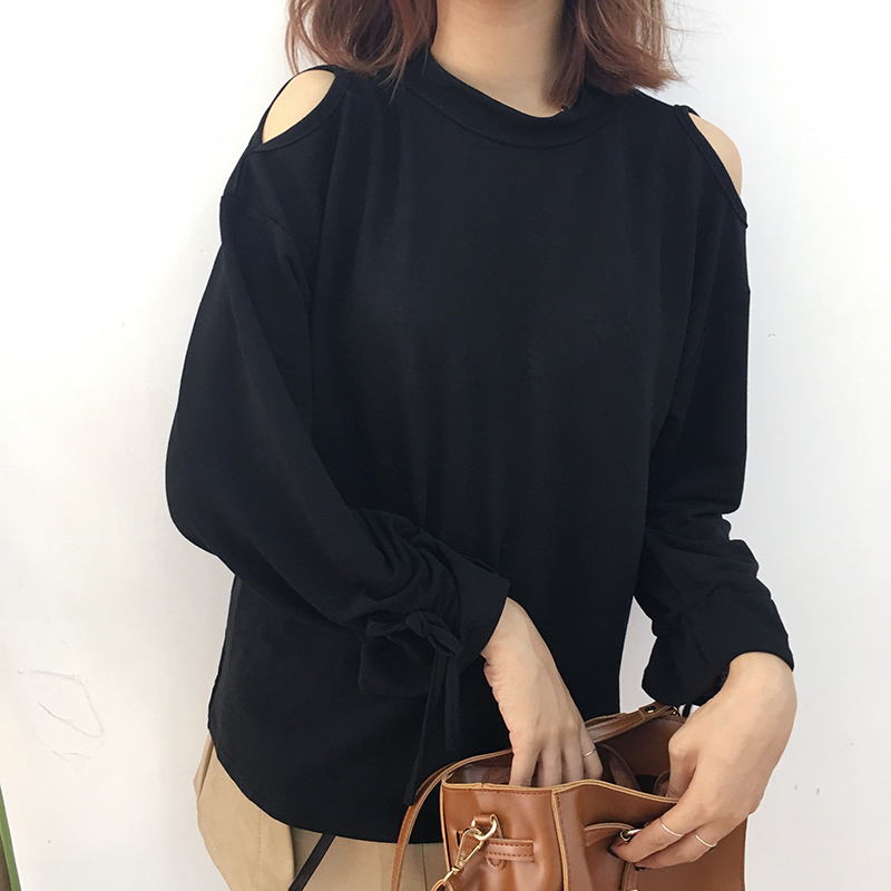 / 早秋女裝新款韓版港味喇叭長袖綁帶針織上衣寬松露肩百搭黑色T恤