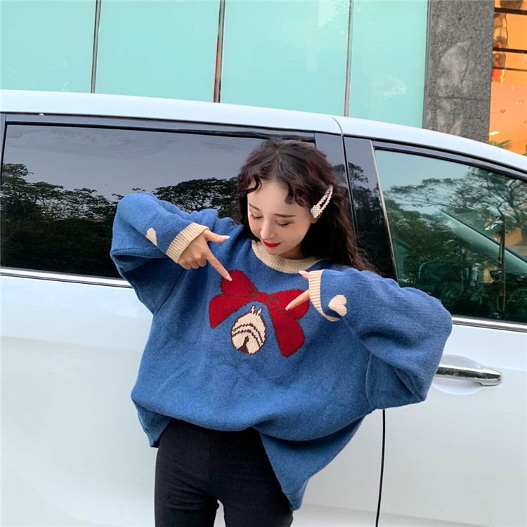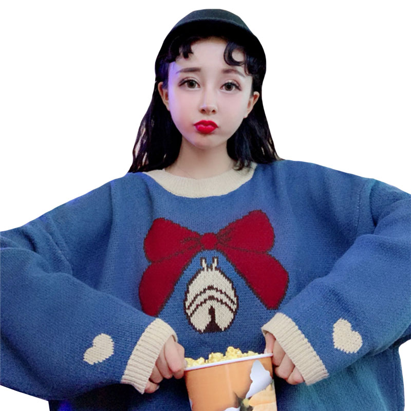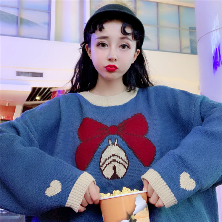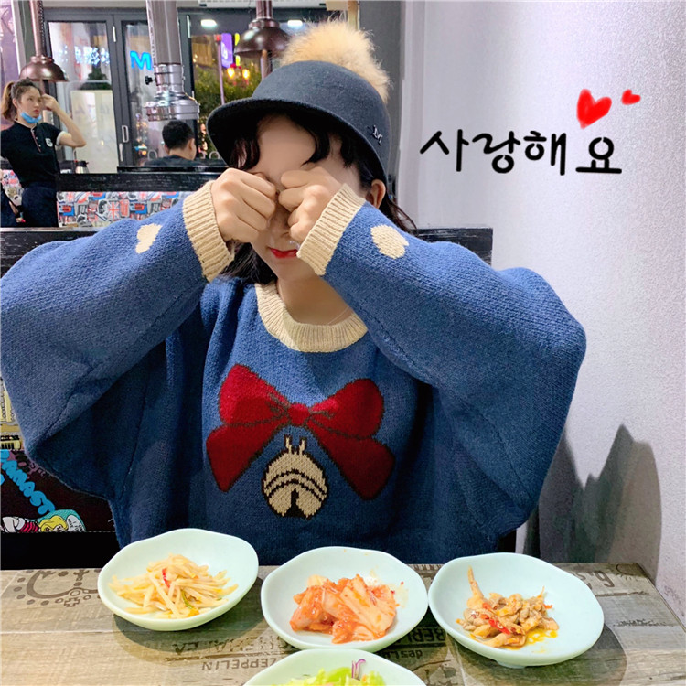 2018新款秋冬韓版學院風卡通寬松慵懶風網紅套頭針織衫毛衣外套女