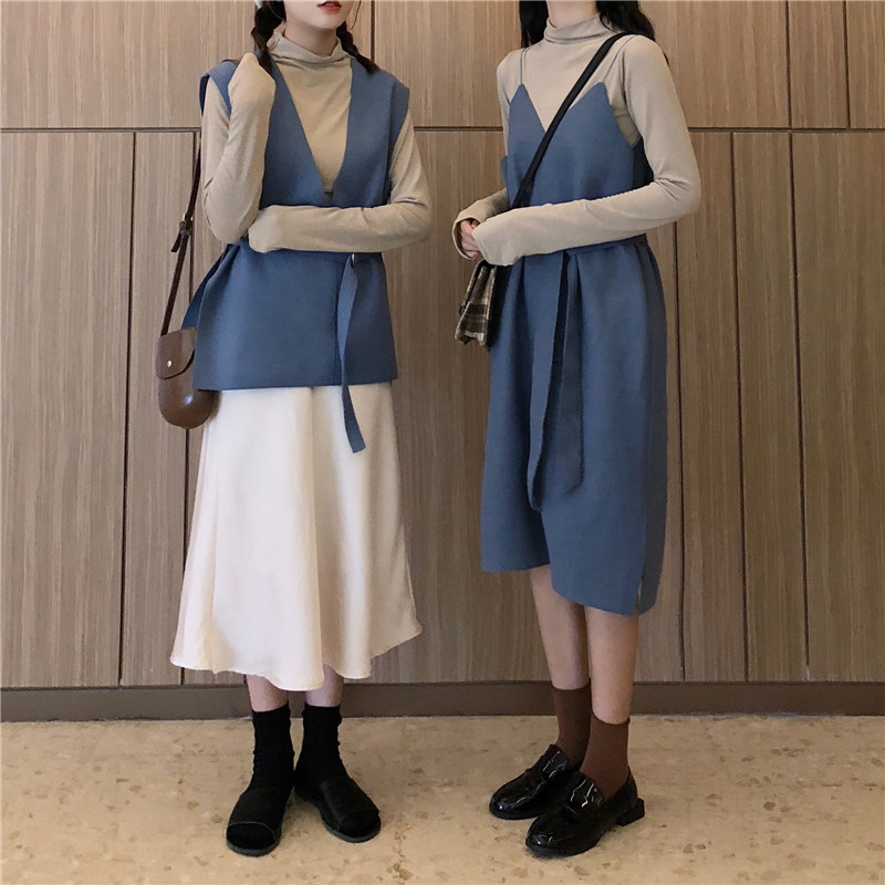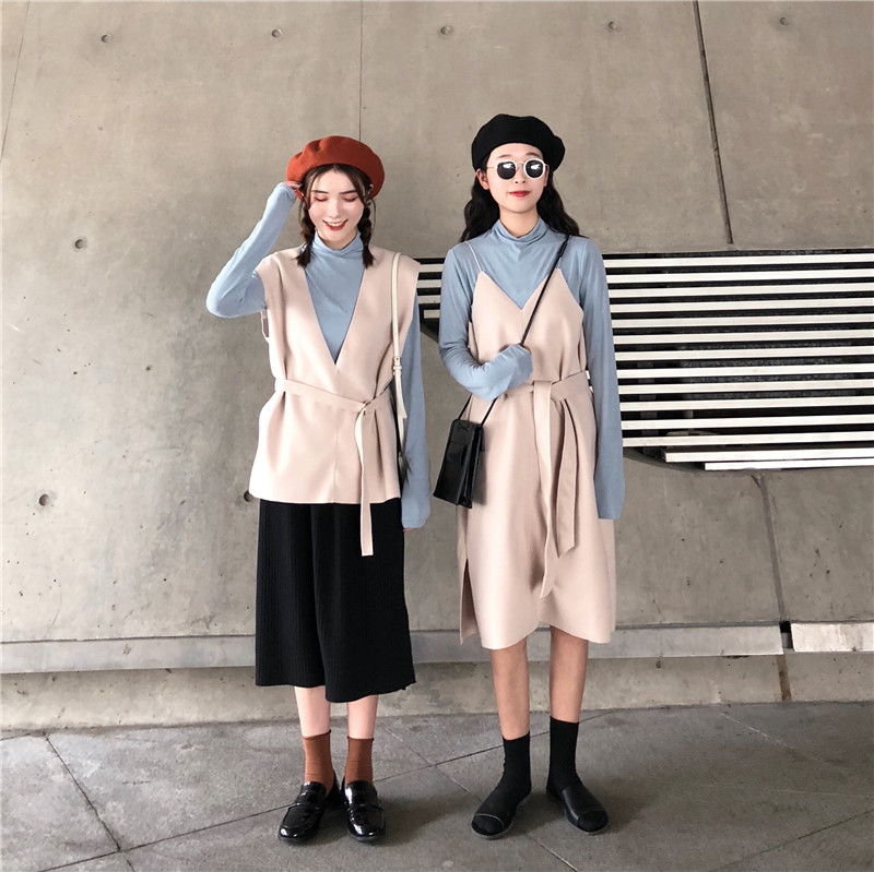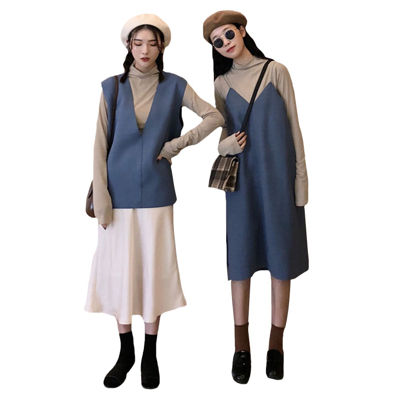 / 韓版時尚休閑套裝秋季女裝呢子V領馬甲背心吊帶連衣裙+T恤三件套