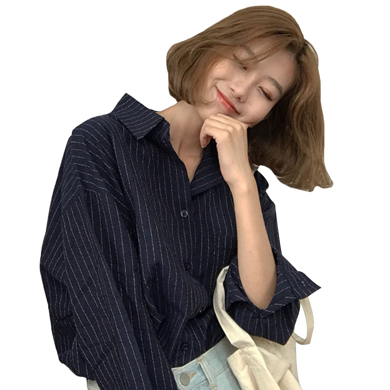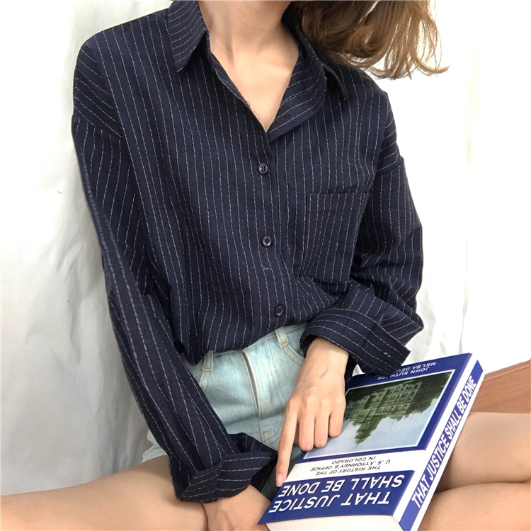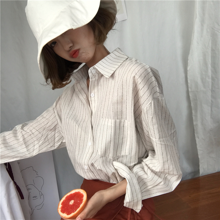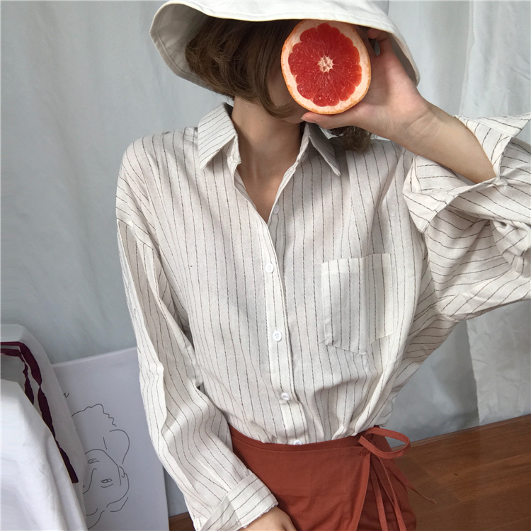 / 秋裝女裝韓版寬松百搭顯瘦豎條紋翻領襯衣學生長袖休閑襯衫上衣潮