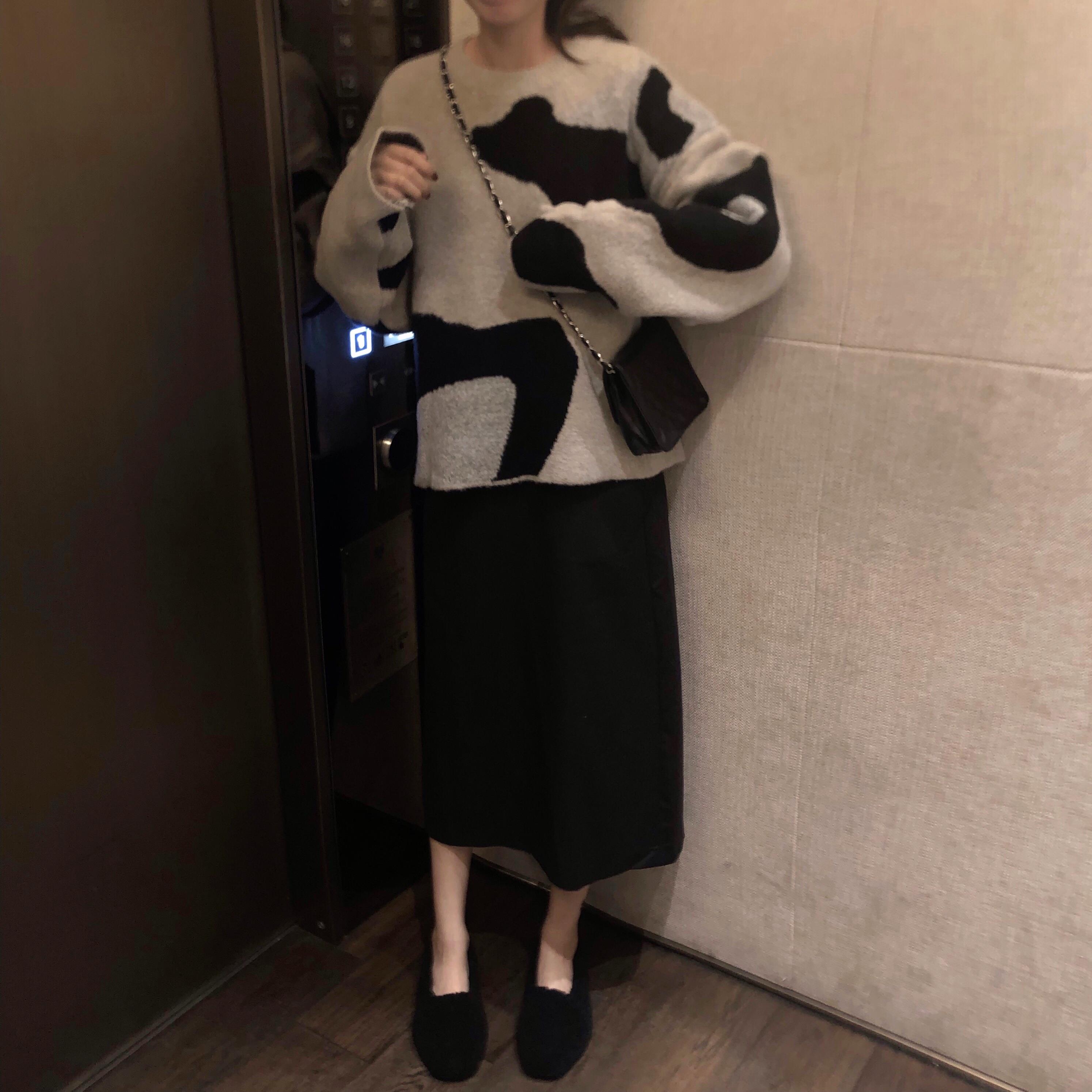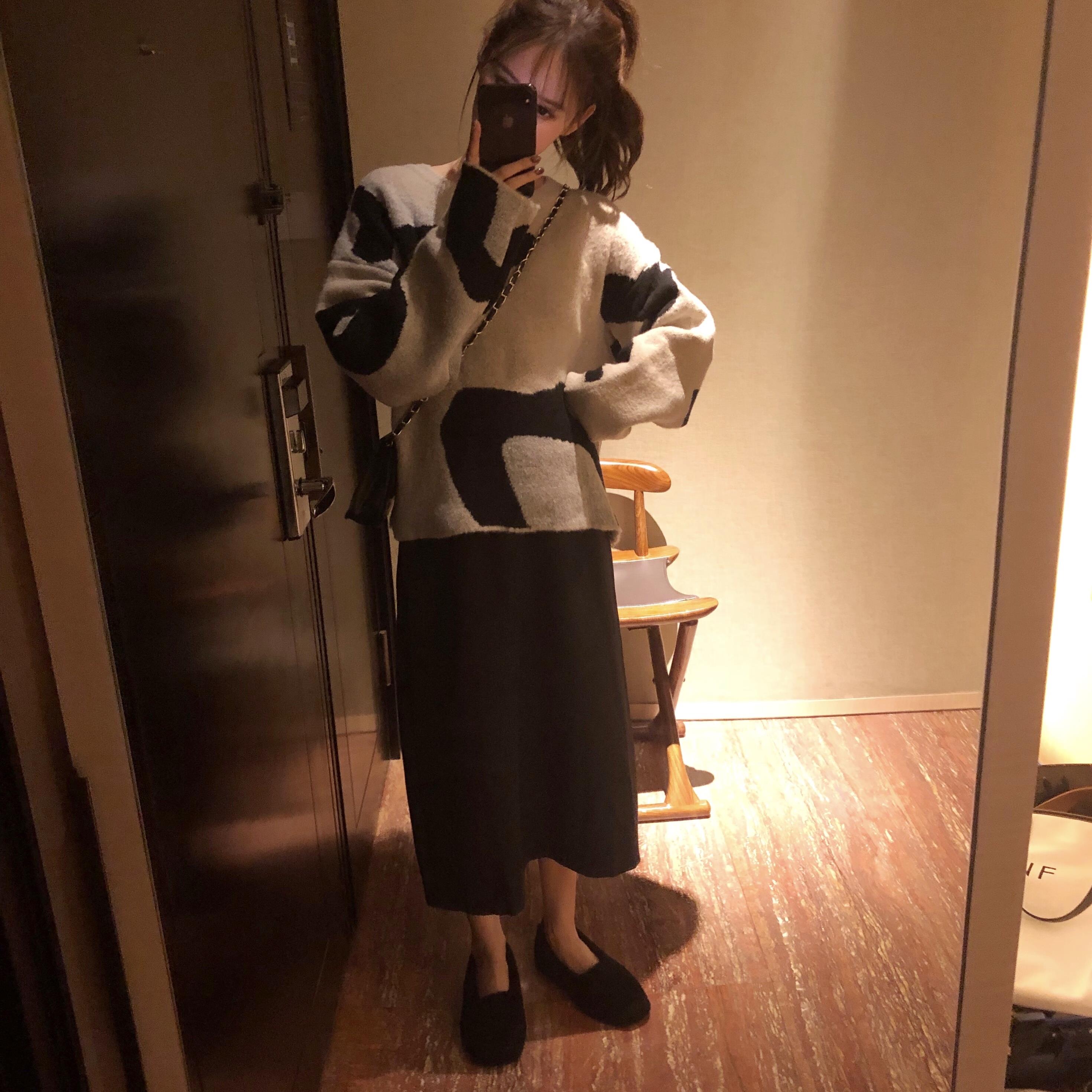 / 韓版時尚休閑套裝秋冬女裝厚實奶牛針織衫毛衣+開叉半身裙兩件套