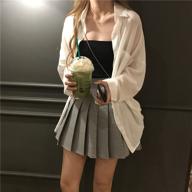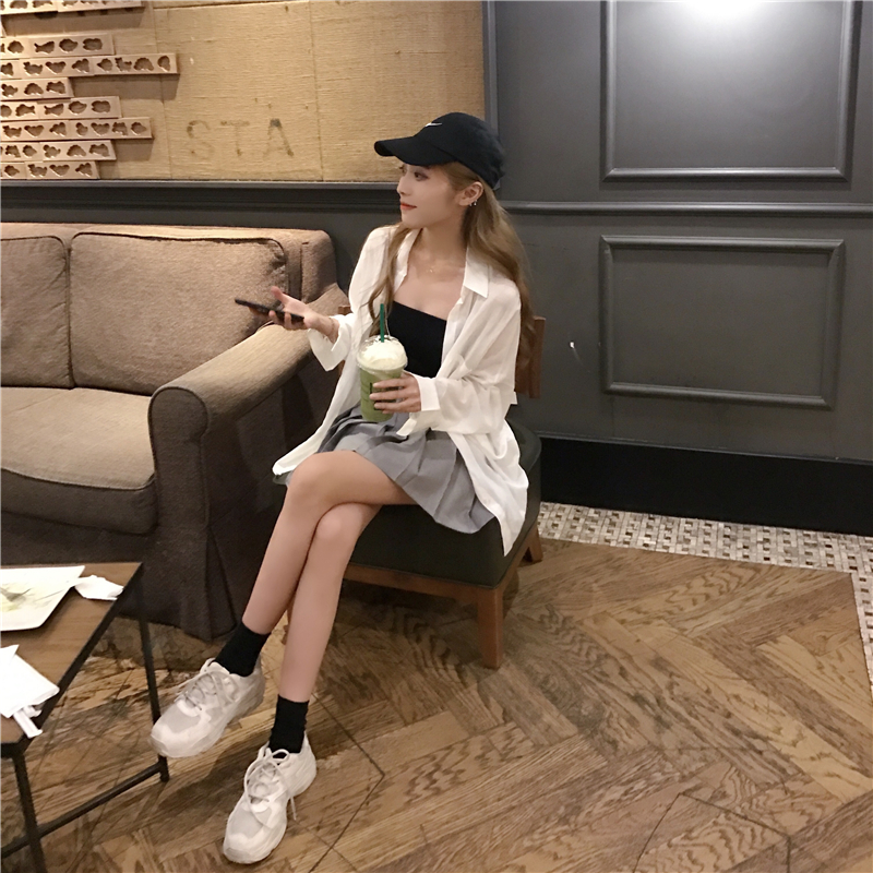 / 韓版時尚休閑套裝夏季女裝針織吊帶背心+百褶裙短裙+防曬衫三件套