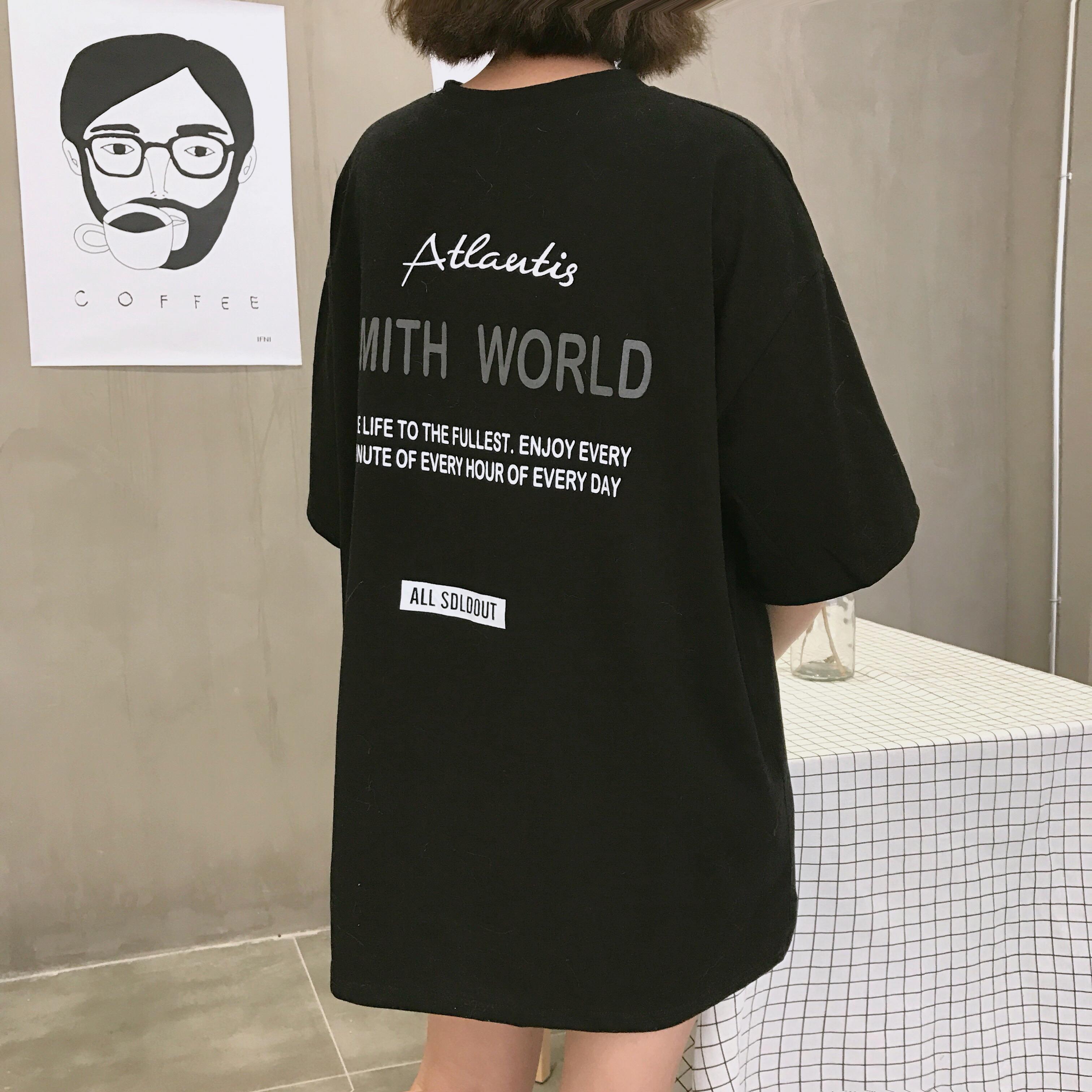夏季新款女裝中長款簡約復古字母印花寬松顯瘦學生短袖T恤上衣女