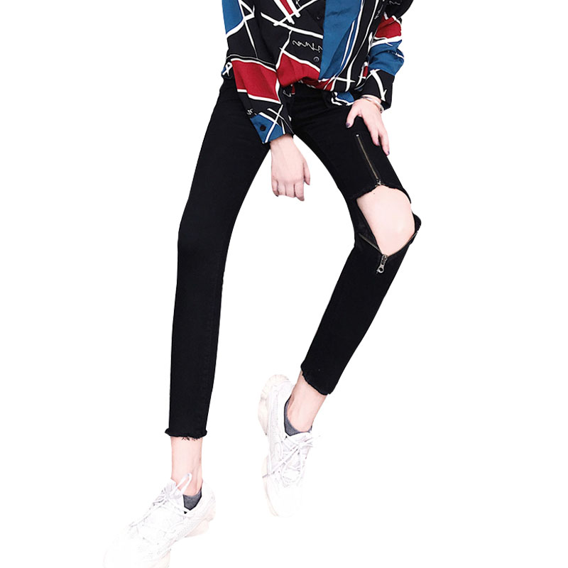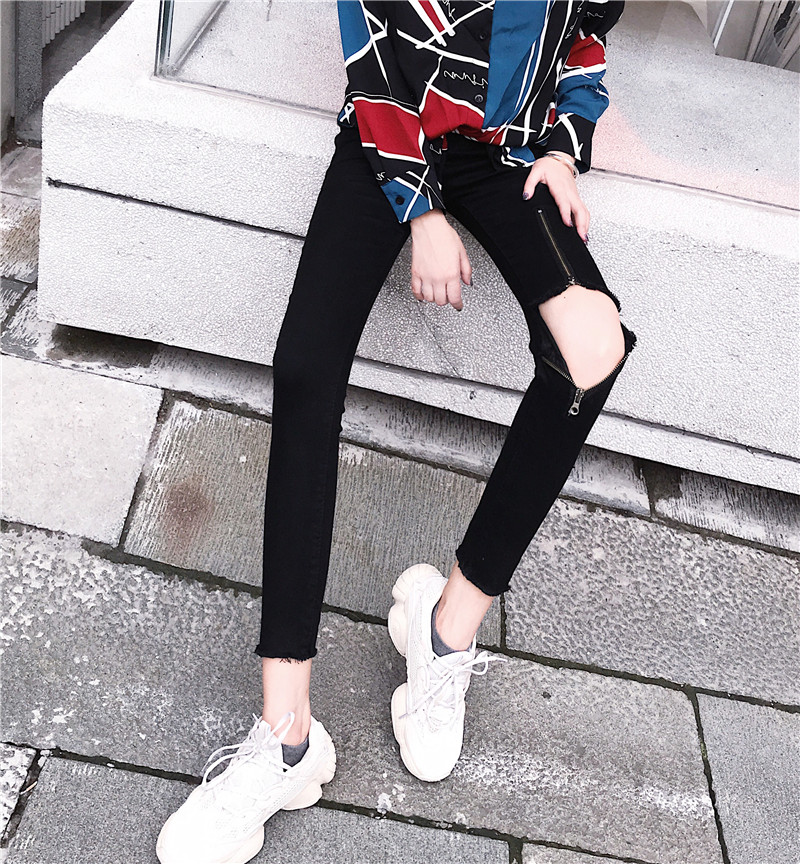 / 秋季韓版個性拉鏈膝蓋破洞黑色牛仔褲高腰緊身彈力九分褲小腳褲女