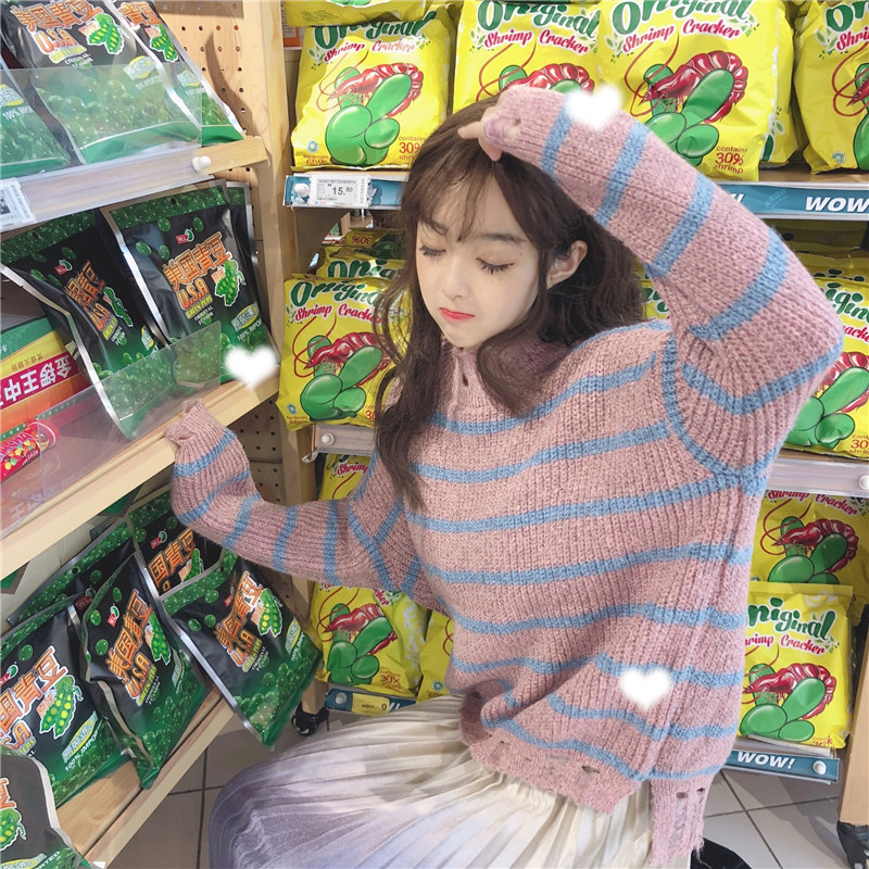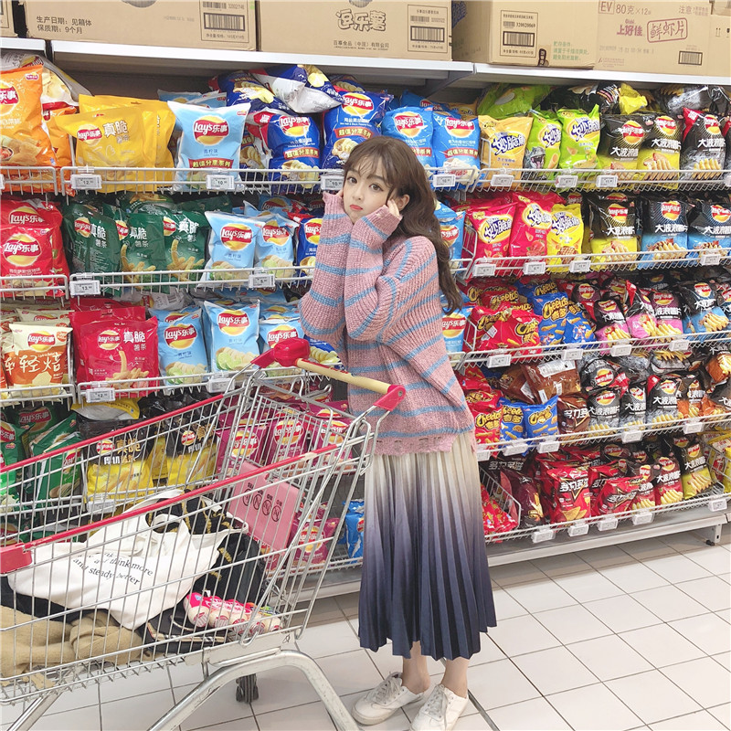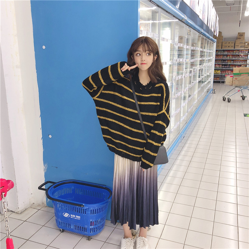 / 韓版時尚休閑套裝秋季破洞條紋針織毛衣+漸變百褶半身裙兩件套女