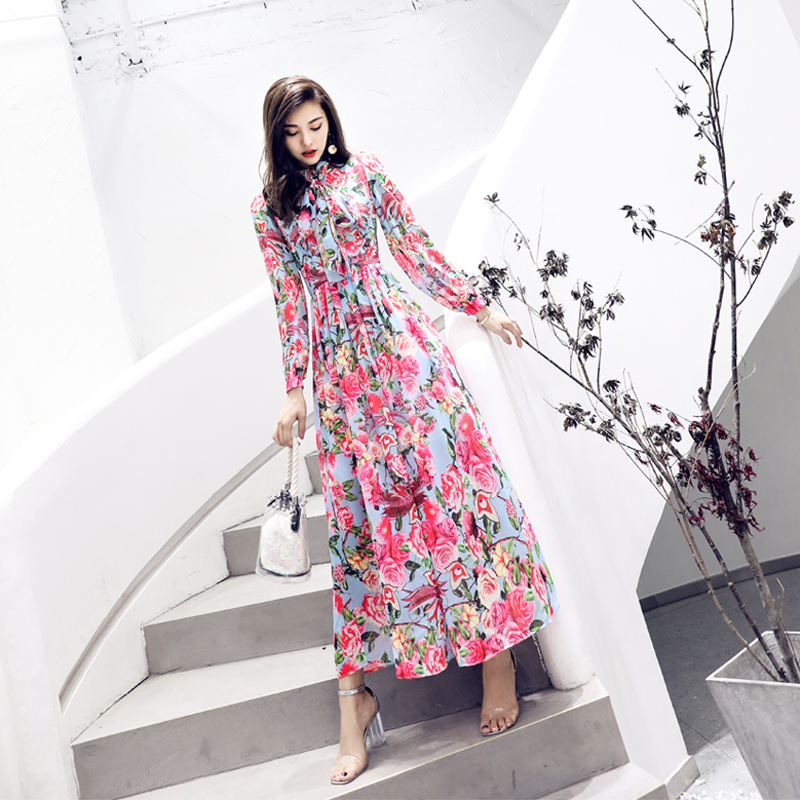 名媛氣質2018初秋新款韓版中長款印花裙子高腰雪紡長袖碎花連衣裙