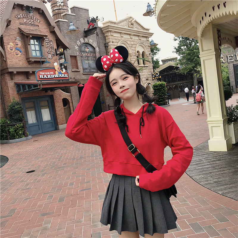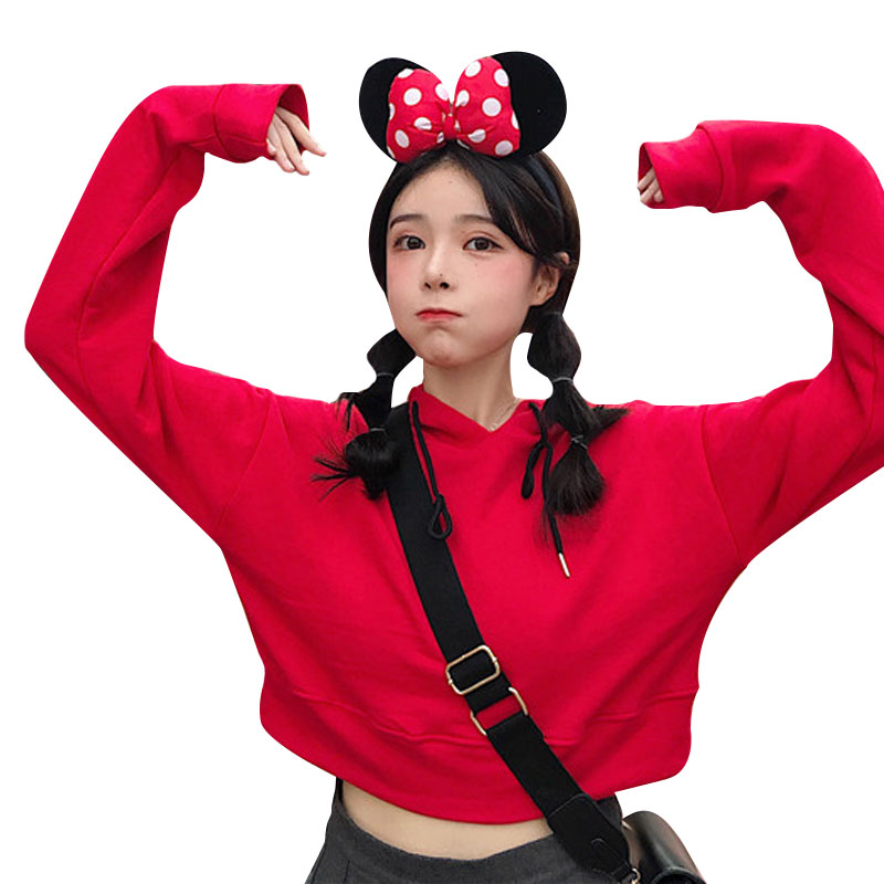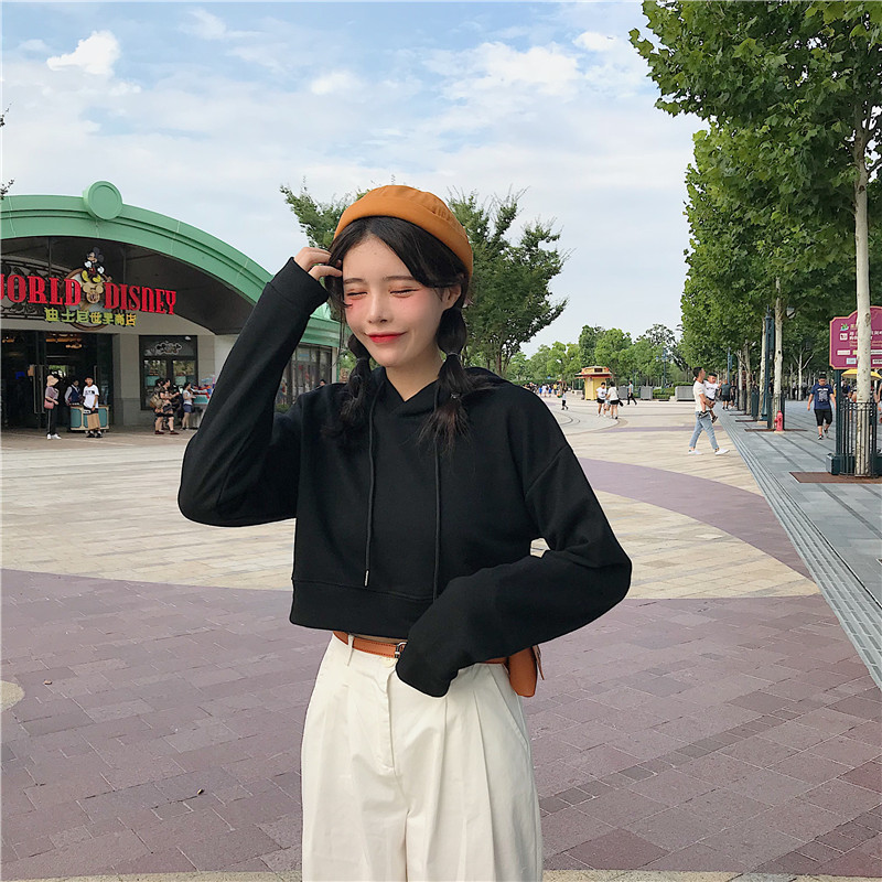 / 秋季女裝韓版純色BF風寬松短款露臍連帽套頭長袖超火衛衣上衣外套