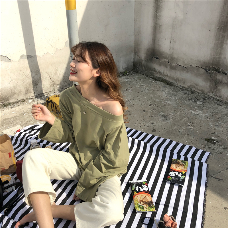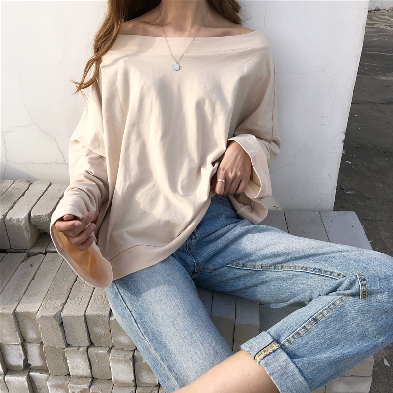 秋裝女裝韓版一字領露肩寬松百搭長袖T恤防曬衣打底衫體恤上衣潮