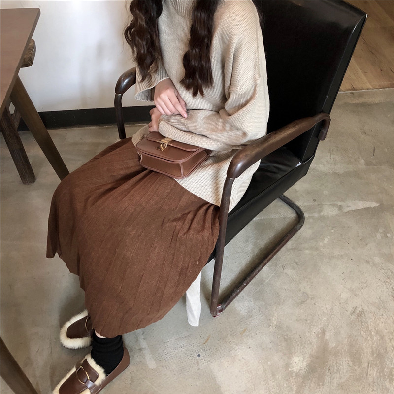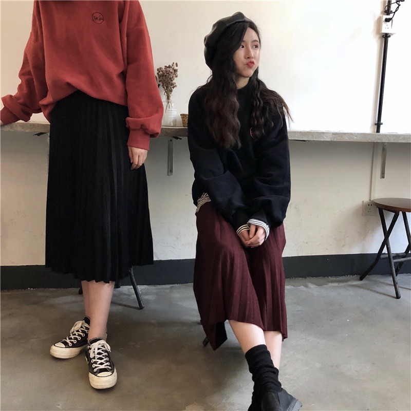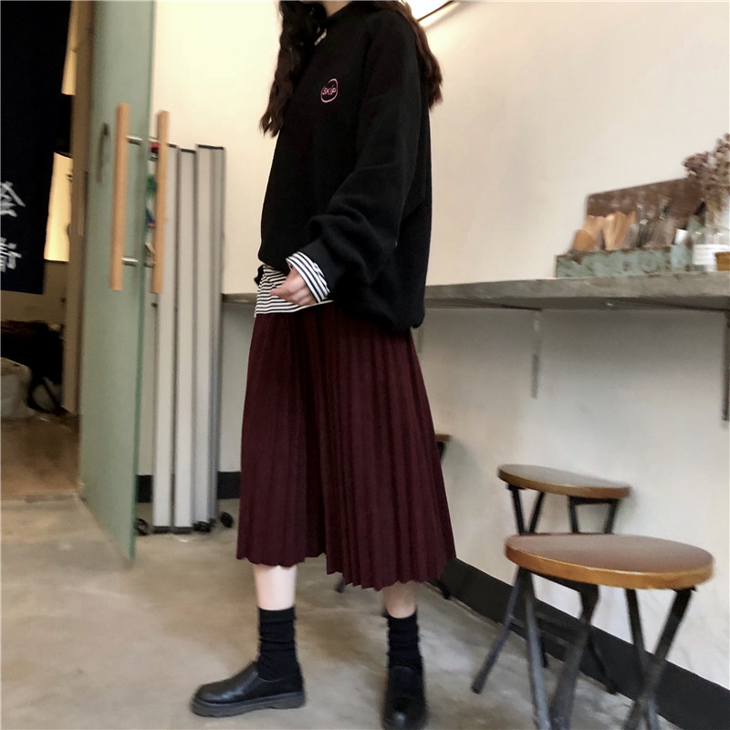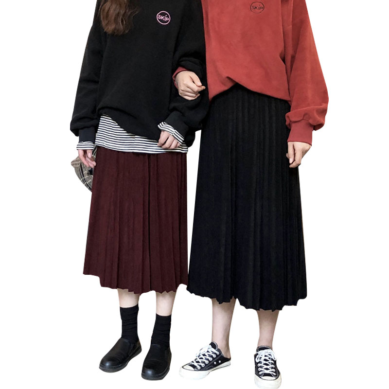 / 秋季韓版復古氣質純色寬松百褶裙中長款高腰顯瘦半身裙傘裙長裙女
