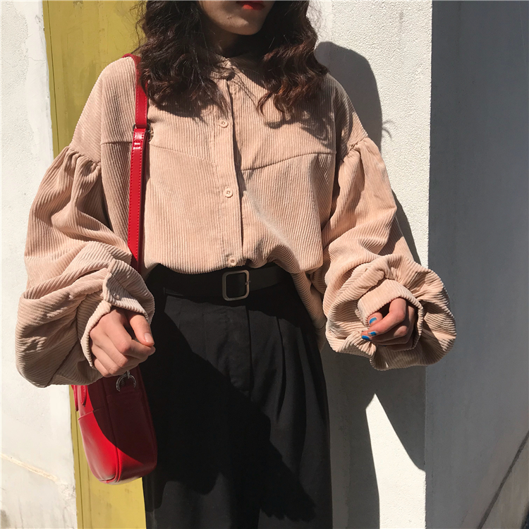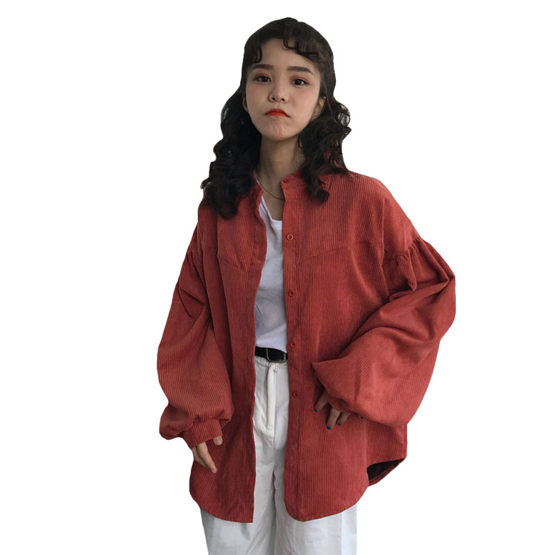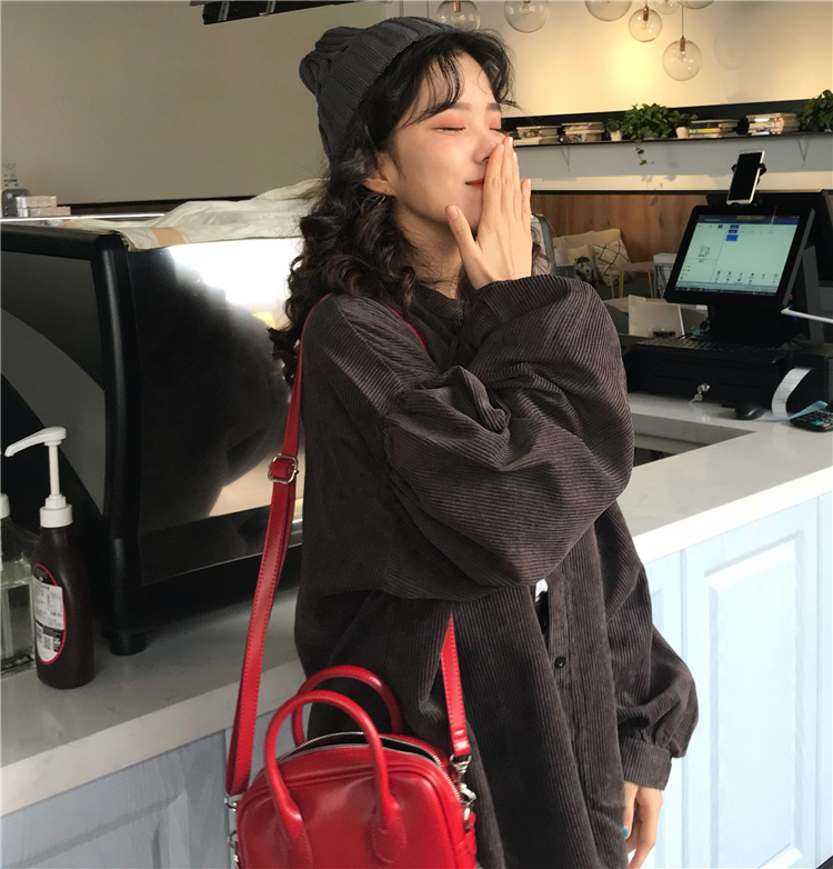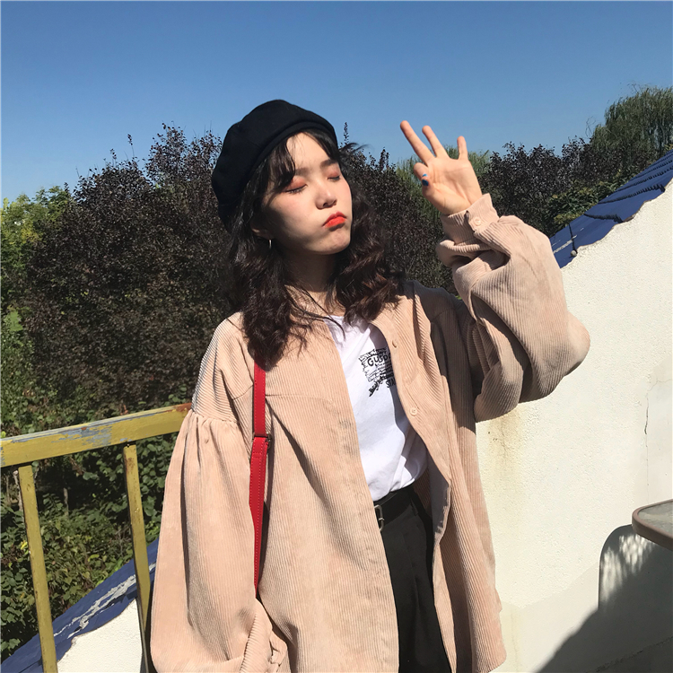 / 秋季女裝韓版中長款復古寬松燈芯絨外套學生工裝糖果色休閑上衣潮