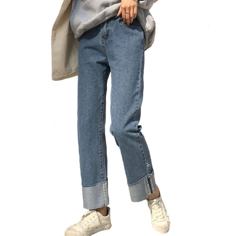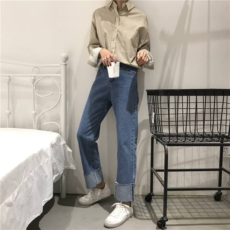 秋裝女裝韓版復古百搭寬松顯瘦卷邊直筒褲牛仔褲九分褲撞色休閑褲
