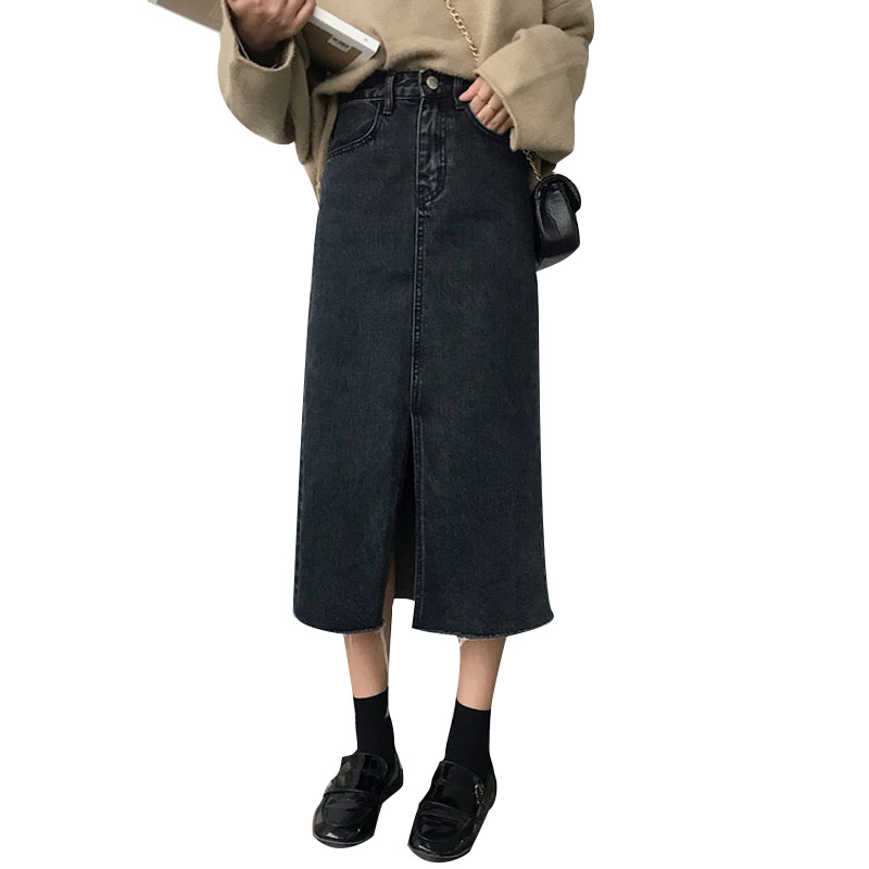 / 秋冬女裝韓版中長款開叉牛仔裙半身裙寬松過膝裙子高腰A字裙長裙