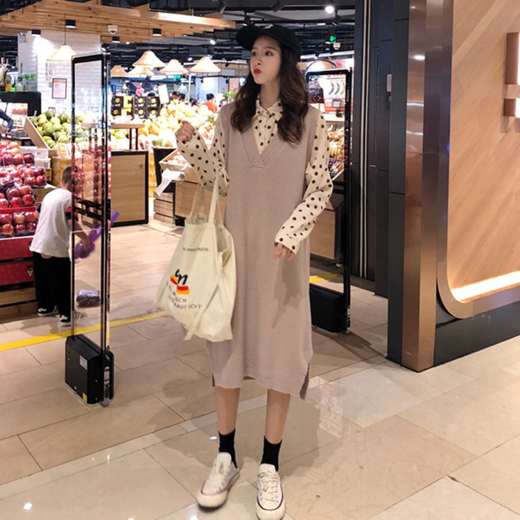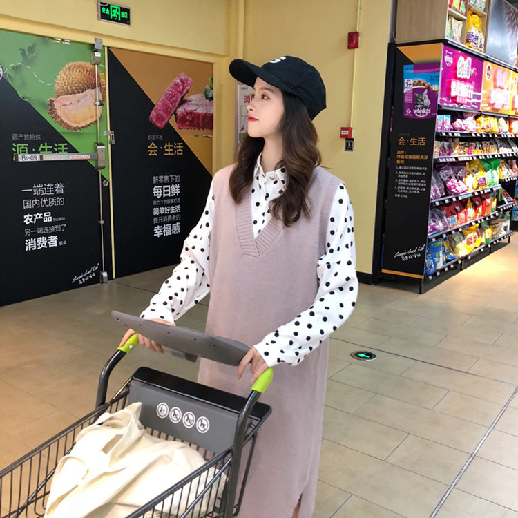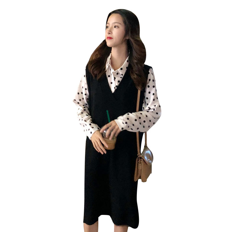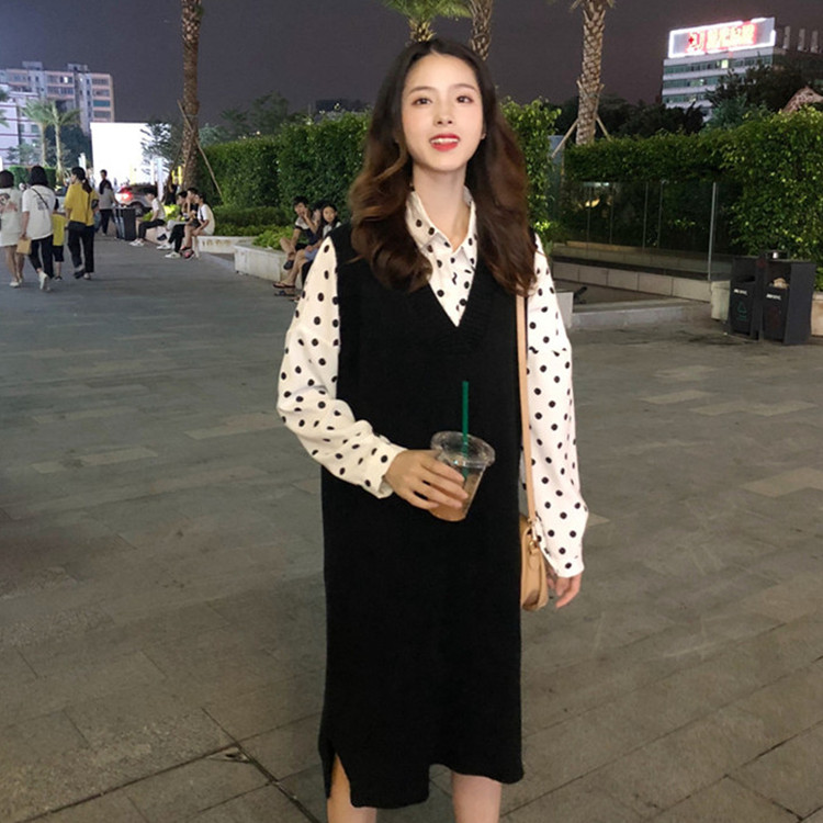 / 韓版時尚休閑套裝秋季女裝V領針織馬甲毛衣背心裙+波點襯衫兩件套