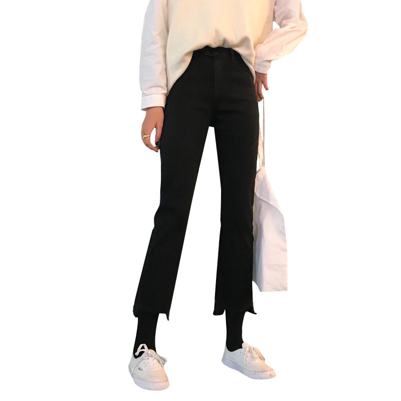/ 秋季女裝韓版不規則褲腳兩粒扣牛仔褲高腰顯瘦直筒褲九分褲闊腿褲