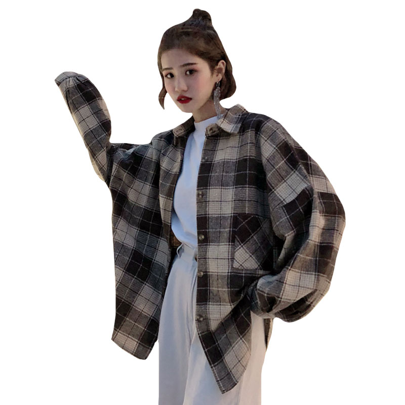 2018新款秋冬韓版中長款復古格子翻領襯衣寬松休閑襯衫上衣外套女