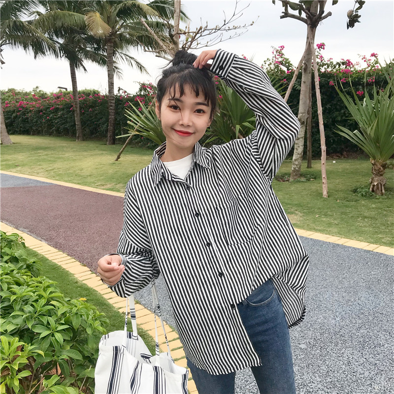 / 早春新款女裝簡約百搭拼色條紋寬松顯瘦學生長袖襯衣開衫外套女