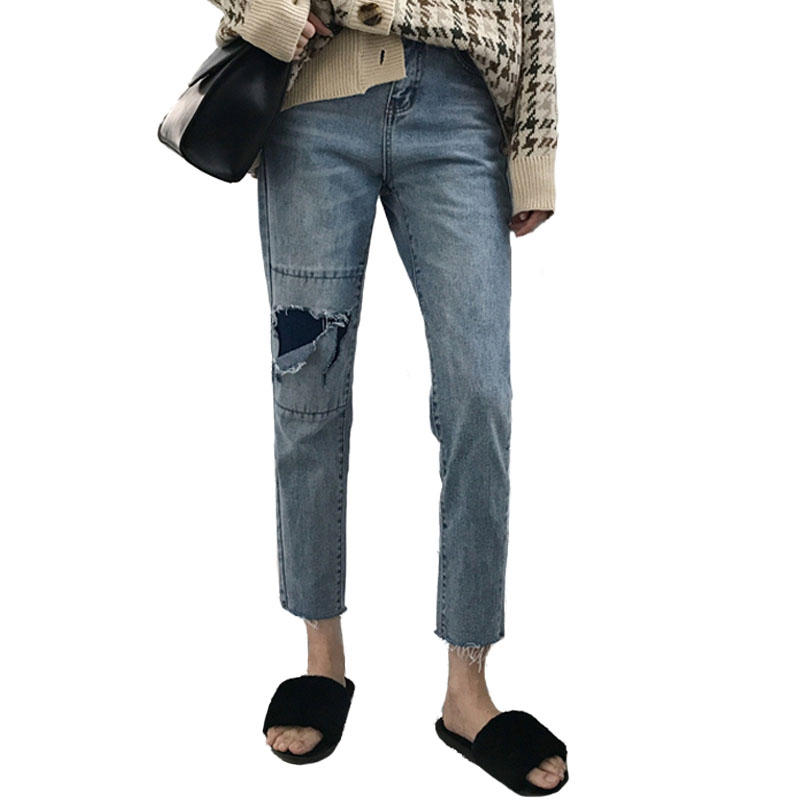 / 秋裝女裝韓版寬松高腰顯瘦破洞牛仔褲直筒褲九分褲學生闊腿褲長褲