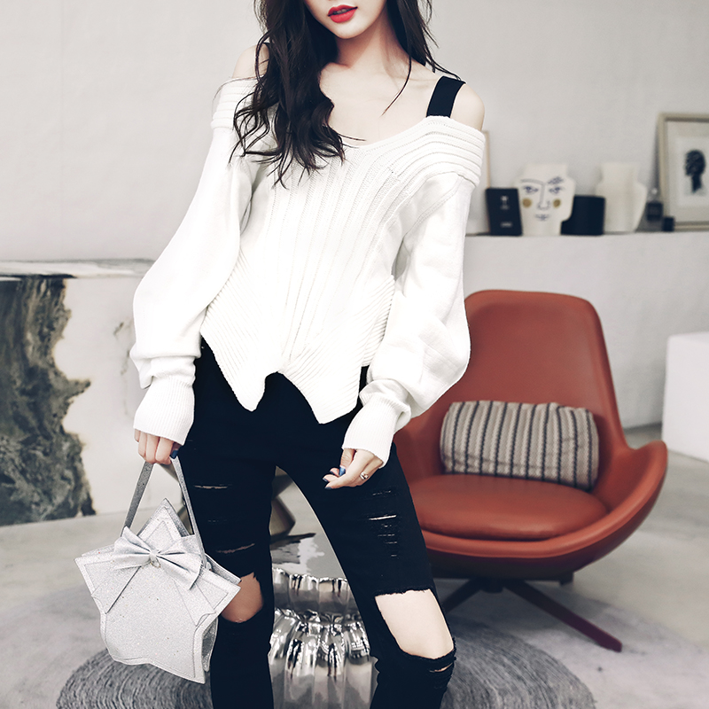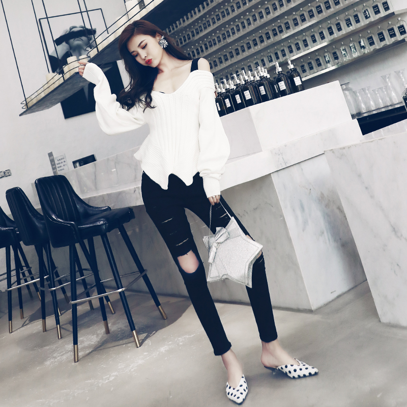 / 2018新款秋裝遮肚子顯瘦吊帶針織衫毛衣破洞牛仔褲兩件套時髦套裝